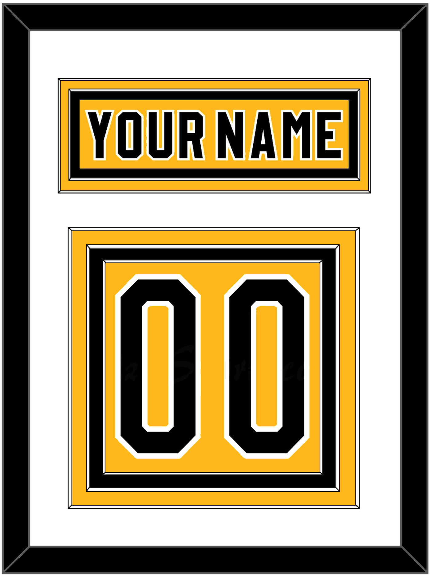 Pittsburgh Alternate Gold Jersey (1980 Through 1981) Nameplate & Numbers (From The Back Of The Jersey). Nameplate Is Double Mat Cut: White Mat Over A Gold Mat. Gold Nameplate Mounted On A Black Mat. To Match The Jersey, Number Is Triple Mat Cut: White Mat Over A Gold Mat Over A Black Mat, Black Number Mounted On A Gold Mat. Black Frame.