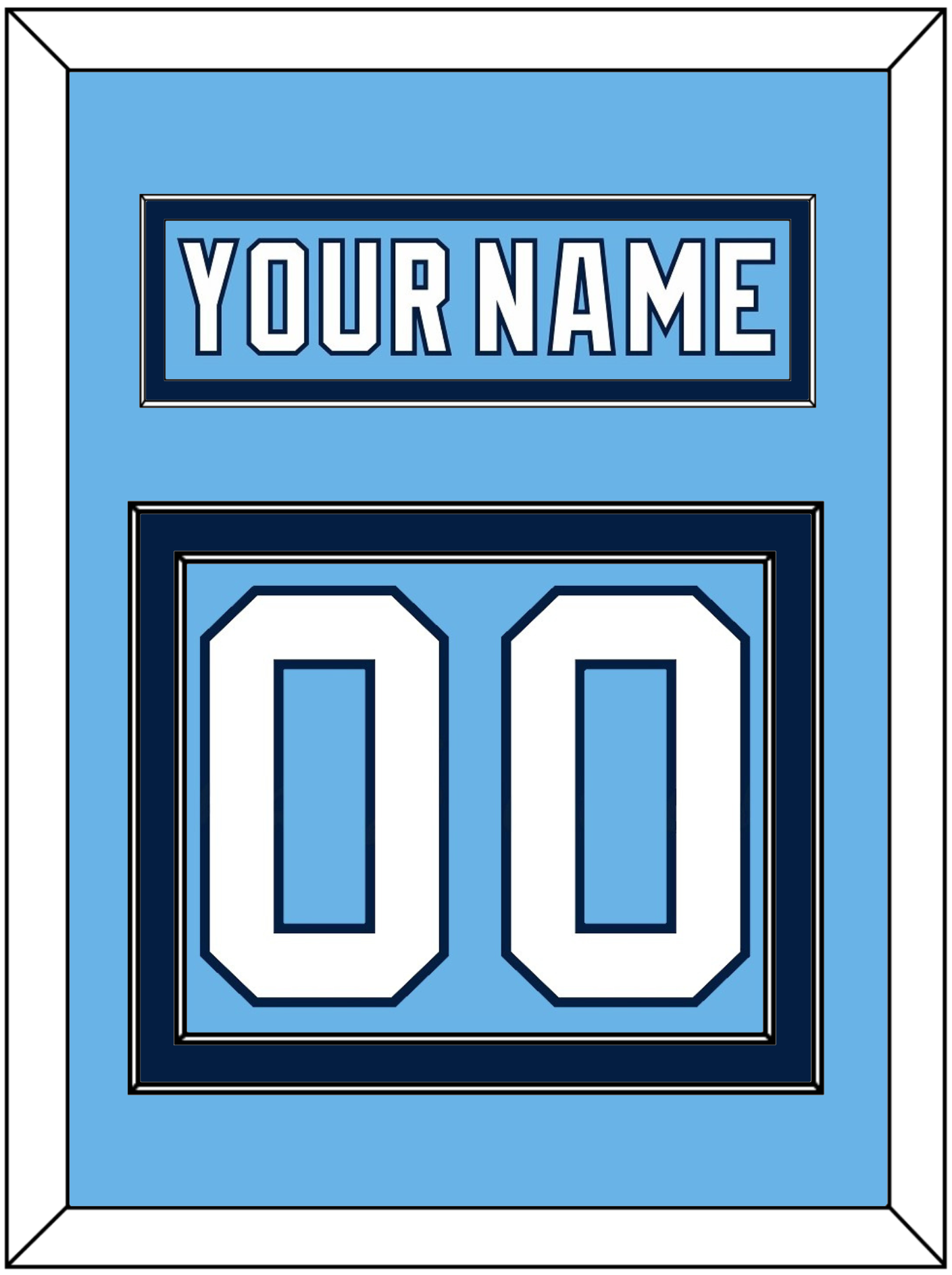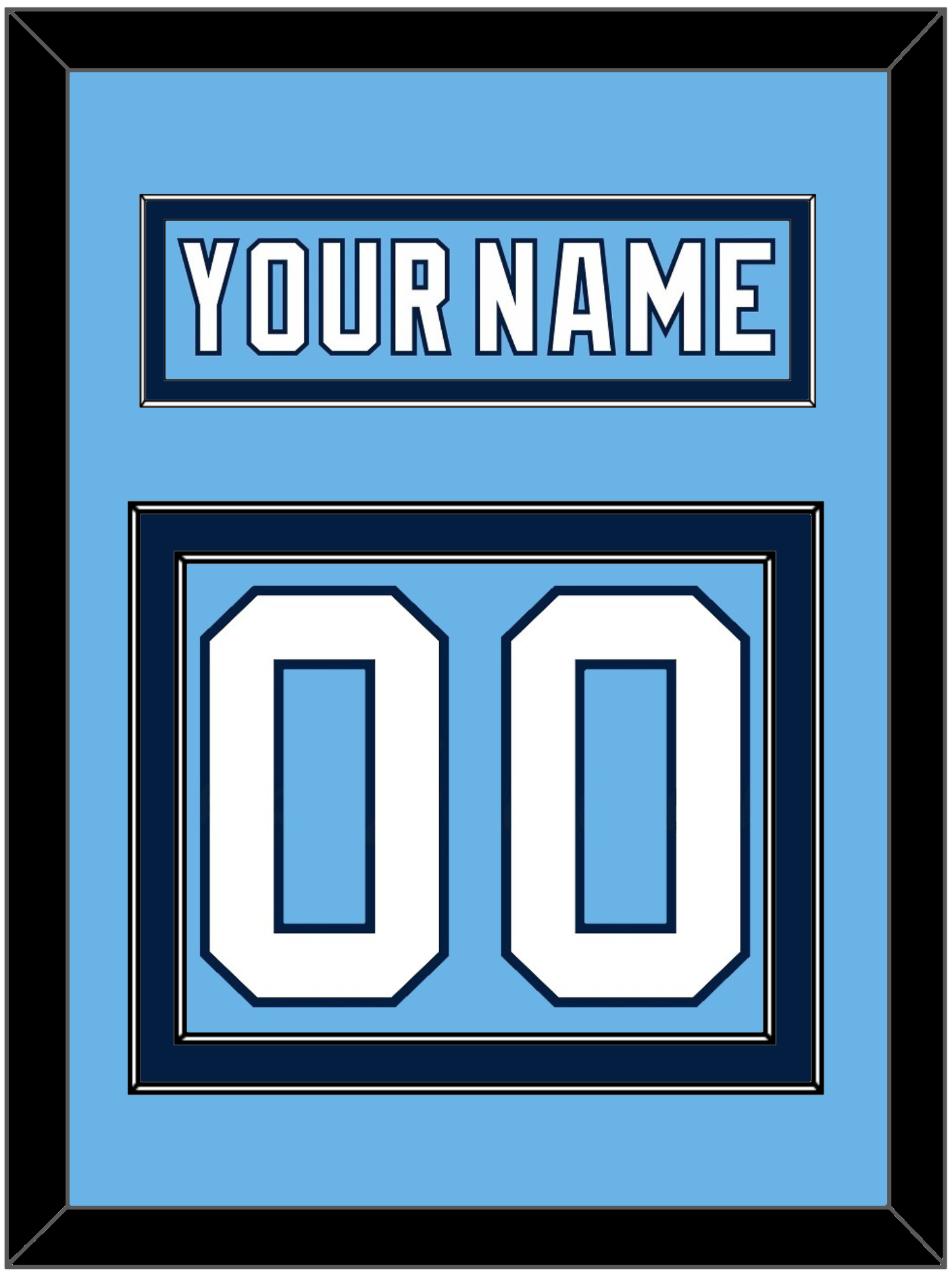 Pittsburgh Alternate Powder Blue (2008 Through 2011) Jersey Nameplate & Numbers (From The Back Of The Jersey). Nameplate Is Single Mat Cut: Powder Blue Mat With Powder Blue Nameplate Mounted On A Navy Blue Mat. To Match The Jersey, Number Is Double Mat Cut: Powder Blue Mat Over A Navy Blue Mat, White Number Mounted On A Powder Blue Mat. White Or Black Frame.