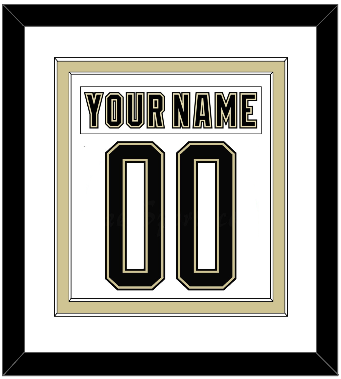 Pittsburgh 2014 Stadium Series White Jersey Nameplate & Number (From The Back Of The Jersey). Double Mat Cut: White Mat Over A Gold Mat. White Nameplate And Black Number Mounted On A White Mat. Black Frame.