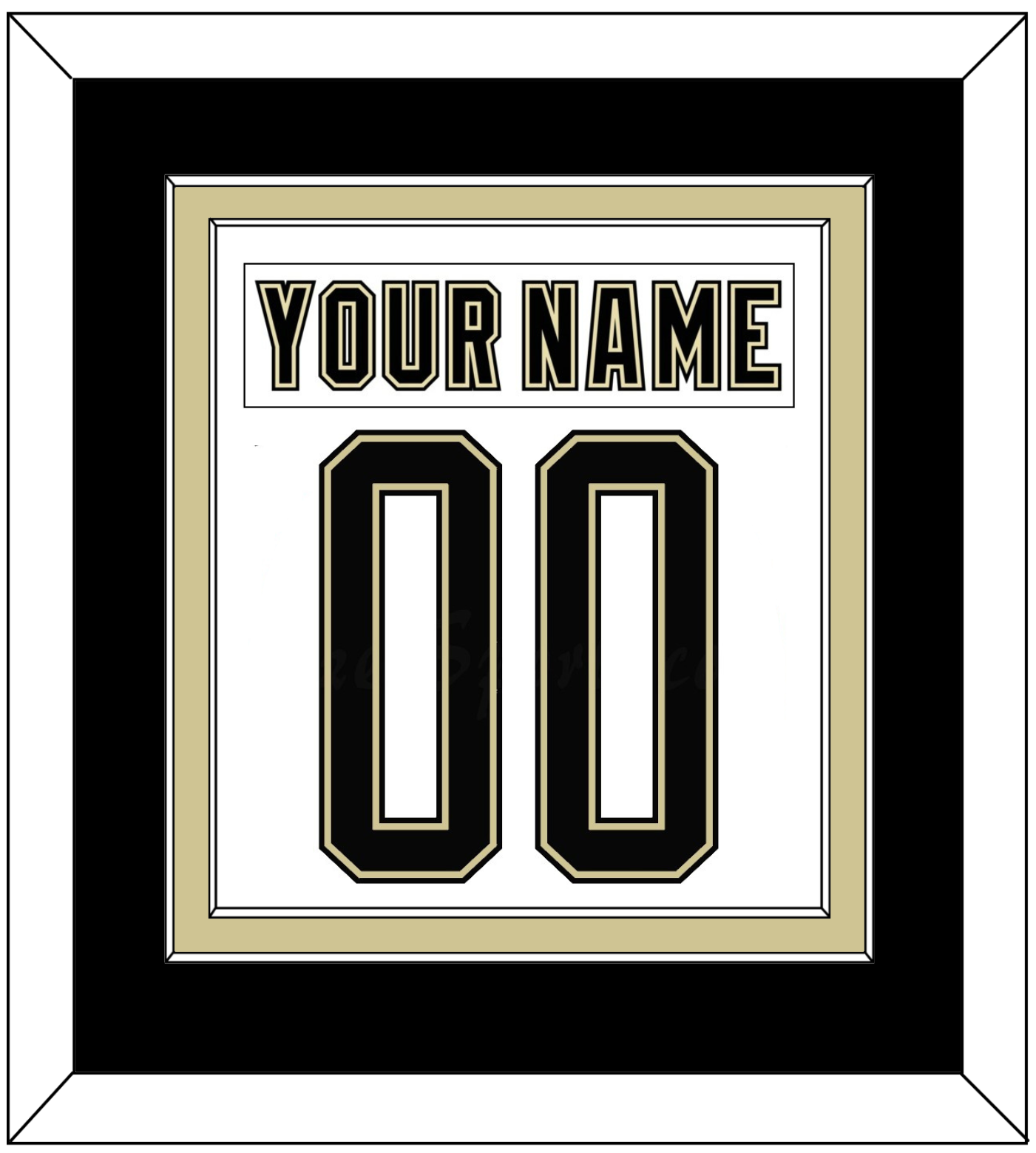 Pittsburgh 2014 Stadium Series White Jersey Nameplate & Number (From The Back Of The Jersey).  Double Mat Cut:  Black Mat Over A Gold Mat.  White Nameplate And Black Number Mounted On A White Mat.  White Frame.