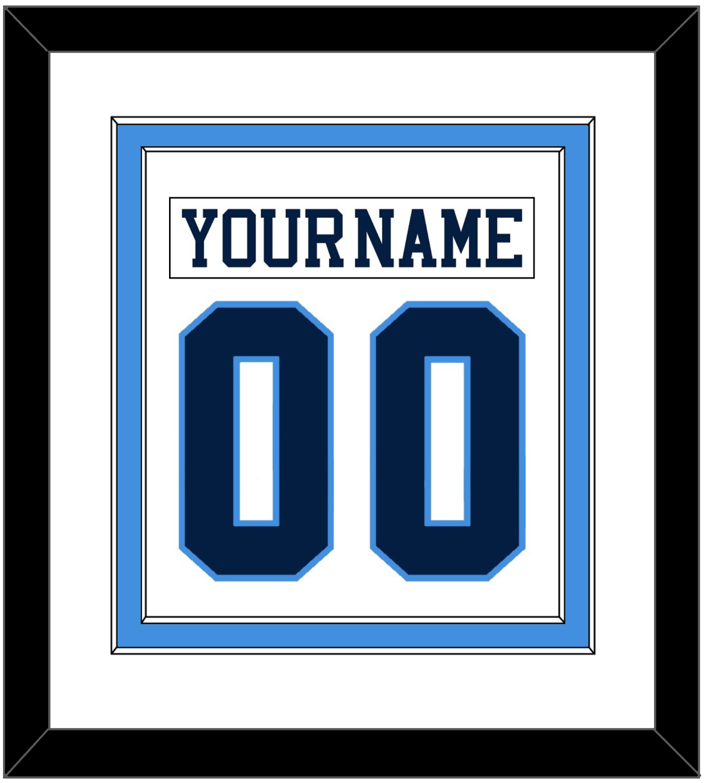 Pittsburgh Home White Jersey (1977 Through 1980) Nameplate & Number (From The Back Of The Jersey). Double Mat Cut: White Mat Over A Powder Blue Mat. White Nameplate And Blue Number Mounted On A White Mat. Black Frame.