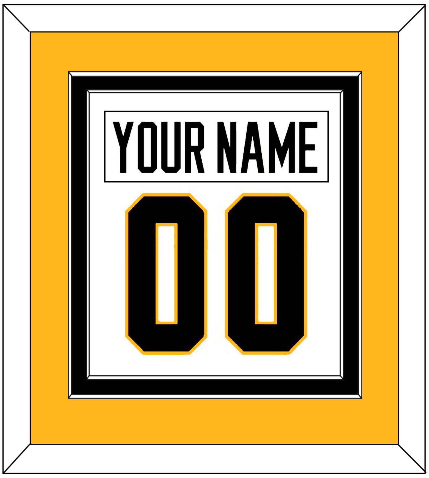Pittsburgh Home White Jersey (1988 Through 1992) Nameplate & Number (From The Back Of The Jersey). Double Mat Cut: Gold Mat Over A Black Mat. White Nameplate And Black Number Mounted On A White Mat. Black Or White Frame.