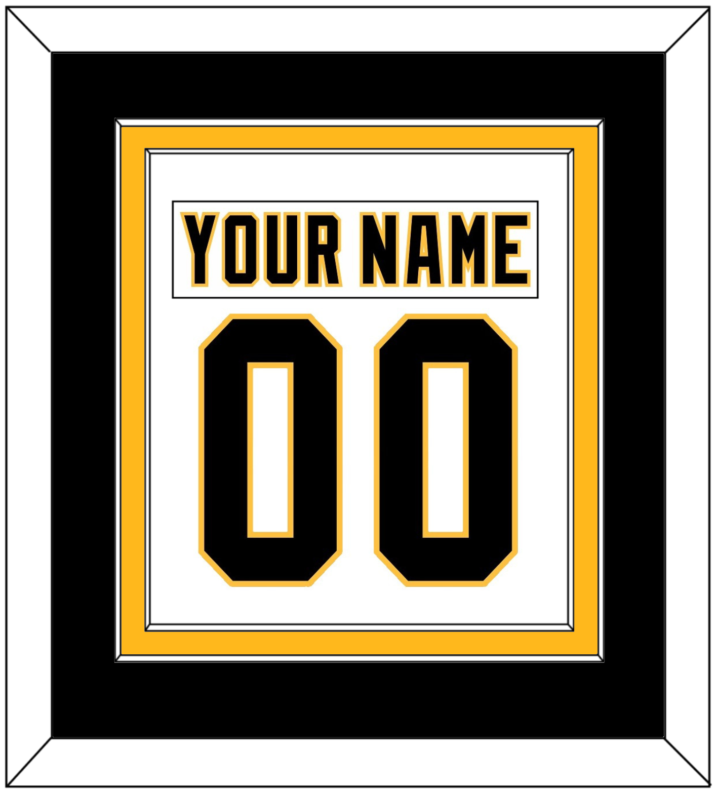 Pittsburgh Home White Jersey (1992 Through 2002) Nameplate & Number (From The Back Of The Jersey). Double Mat Cut: Black Mat Over A Gold Mat. White Nameplate And Black Number Mounted On A White Mat. White Frame.