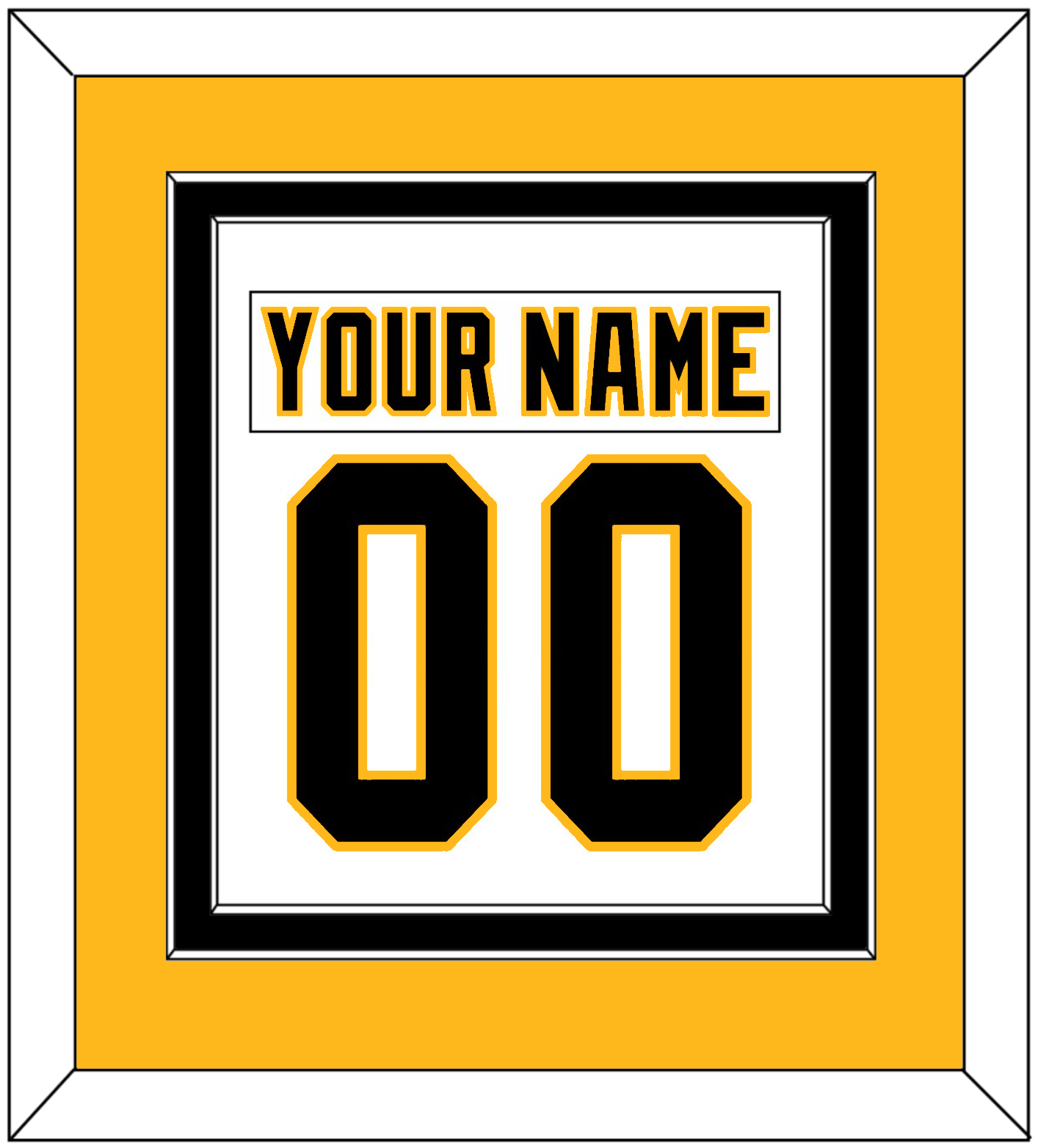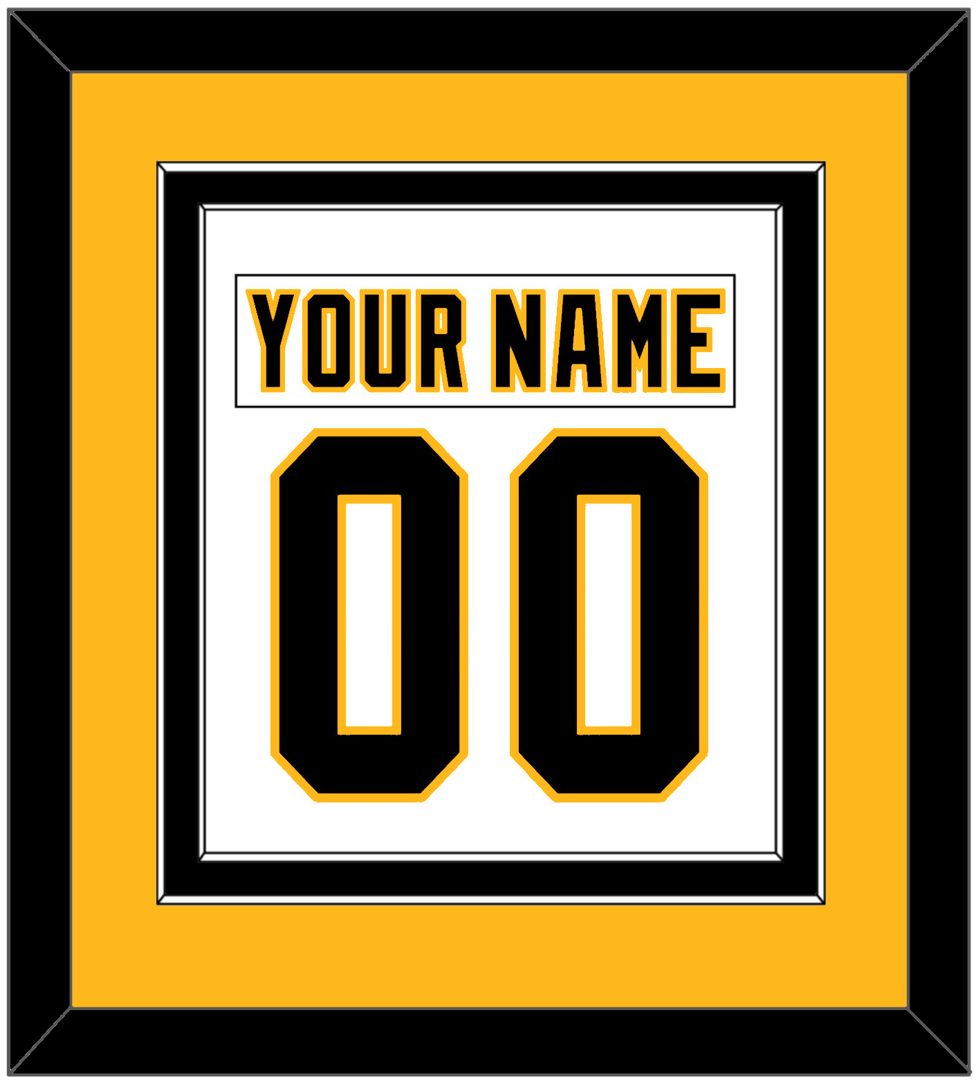 Pittsburgh Home White Jersey (1992 Through 2002) Nameplate & Number (From The Back Of The Jersey). Double Mat Cut: Gold Mat Over A Black Mat. White Nameplate And Black Number Mounted On A White Mat. Black Or White Frame.