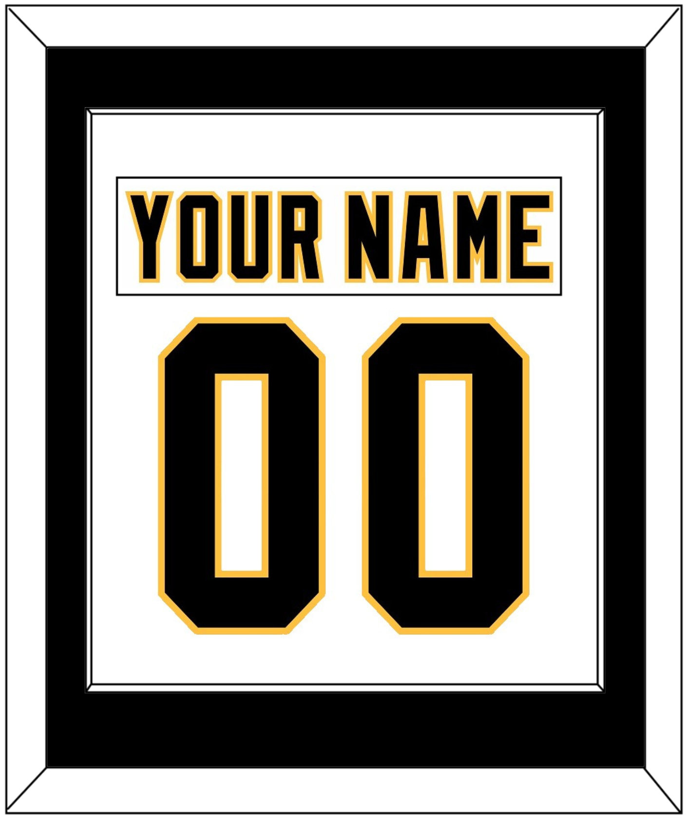 Pittsburgh Home White Jersey (1992 Through 2002) Nameplate & Number (From The Back Of The Jersey). Single Mat Cut: Black Mat With White Nameplate And Black Number Mounted On A White Mat. White Frame.
