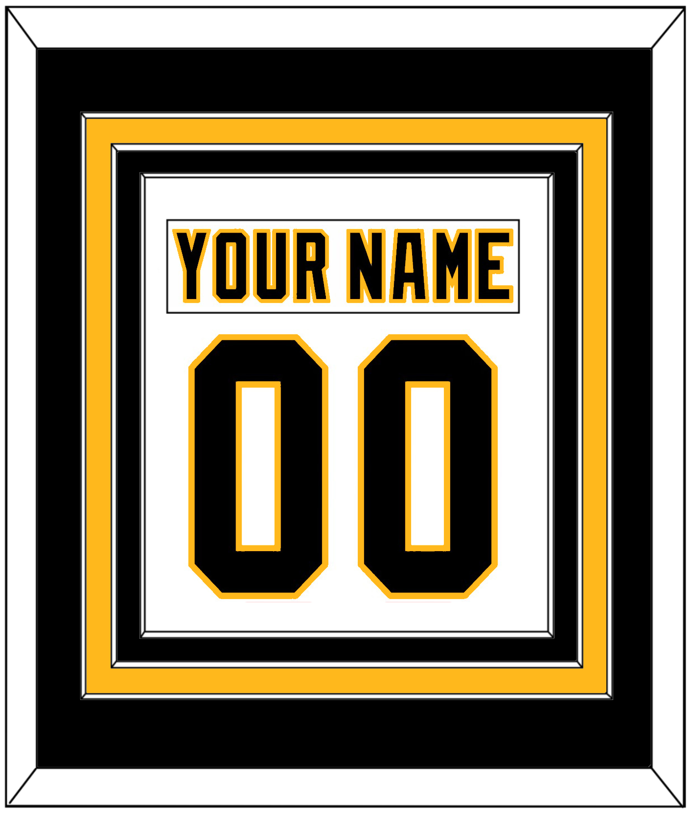 Pittsburgh Home White Jersey (1992 Through 2002) Nameplate & Number (From The Back Of The Jersey). Double Mat Cut: Black Mat Over A Gold Mat Over A Black Mat. White Nameplate And Black Number Mounted On A White Mat. White Frame.