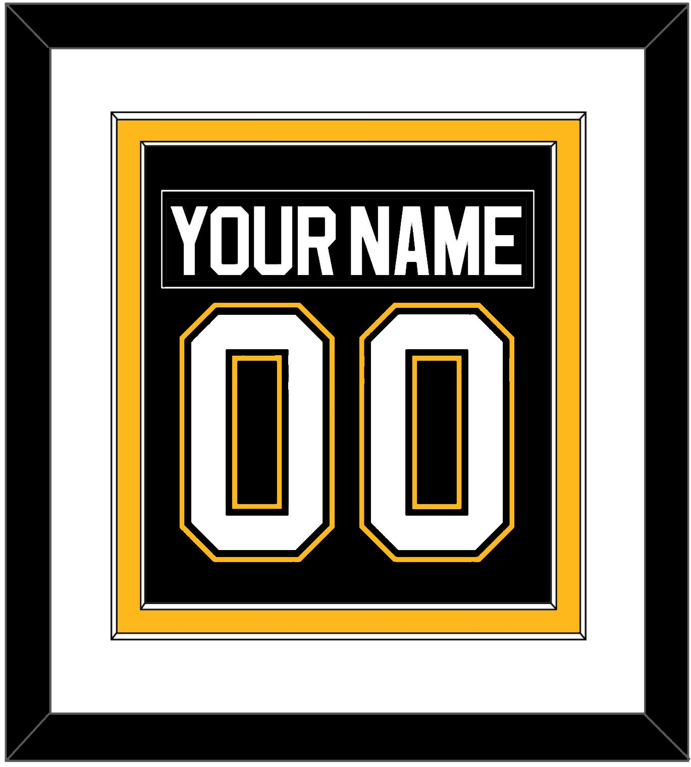 Pittsburgh Road/Alternate Black Jersey (1995 Through 2002) Nameplate & Number (From The Back Of The Jersey).  Double Mat Cut:  White Mat Over A Gold Mat.  Black Nameplate And White Number Mounted On A Black Mat.  Black Frame.