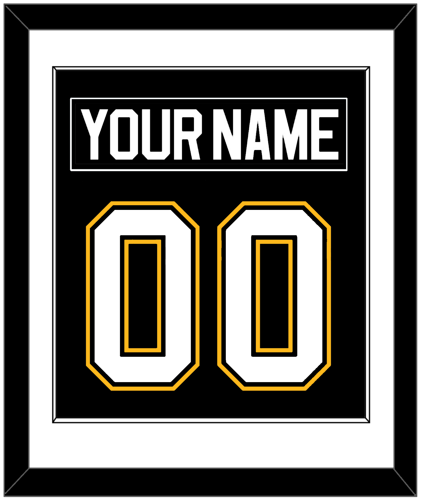Pittsburgh Road/Alternate Black Jersey (1995 Through 2002) Nameplate & Number (From The Back Of The Jersey). Single Mat Cut: White Mat With Black Nameplate And White Number Mounted On A Black Mat. Black Frame.