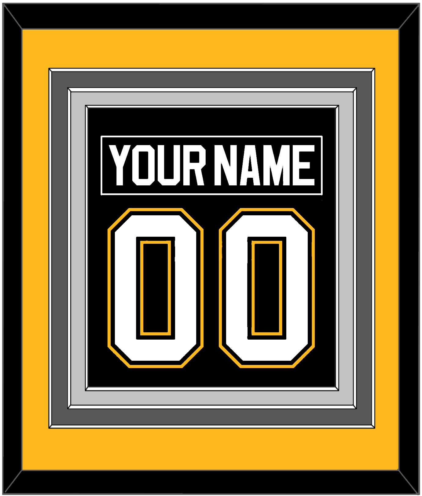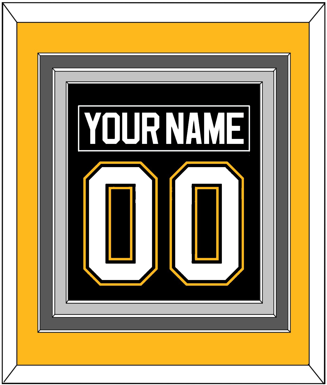 Pittsburgh Road/Alternate Black Jersey (1995 Through 2002) Nameplate & Number (From The Back Of The Jersey).  Double Mat Cut:  Gold Mat Over A Dark Gray Mat Over A Light Gray Mat.  Black Nameplate And White Number Mounted On A Black Mat.  Black Or White Frame.