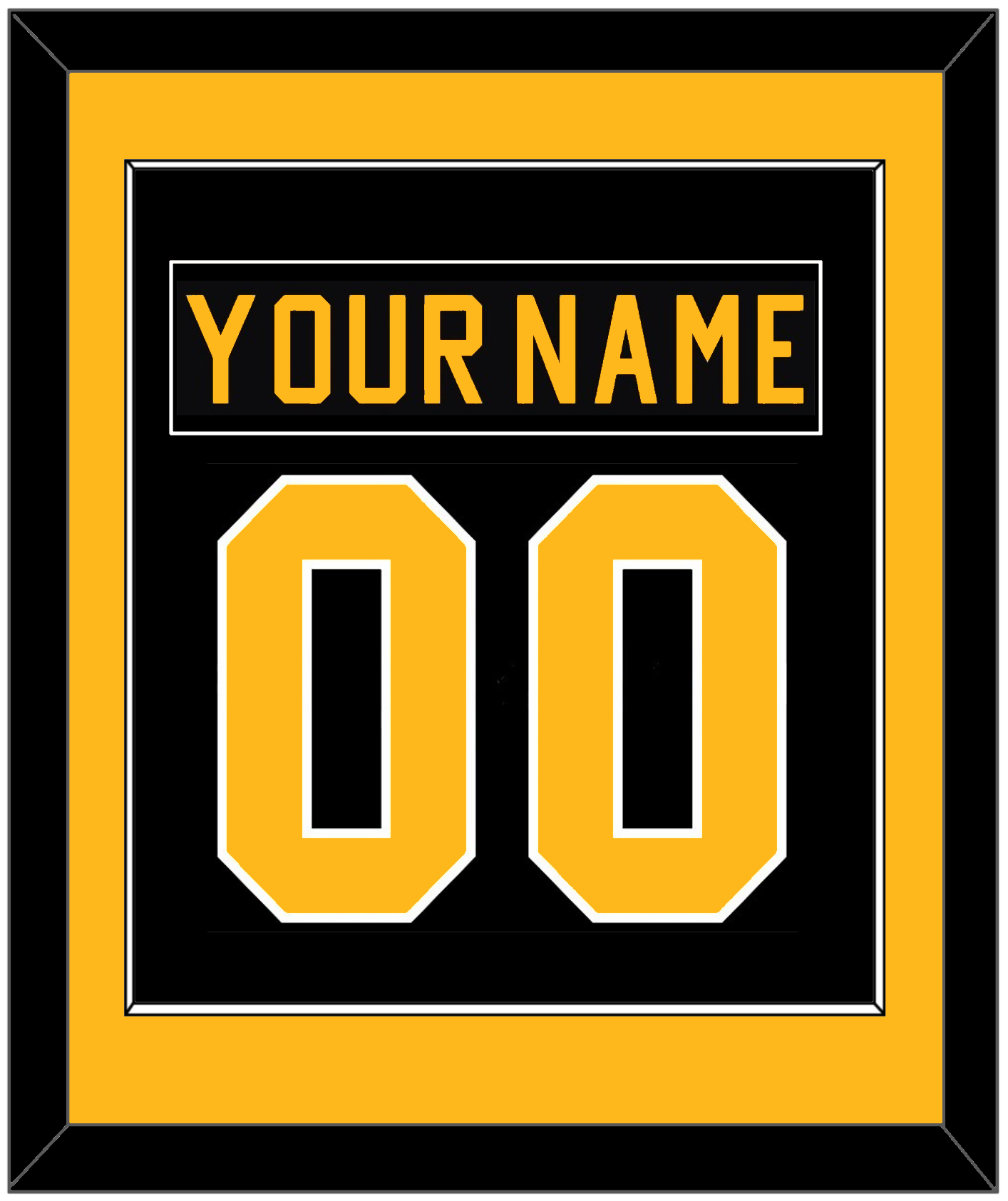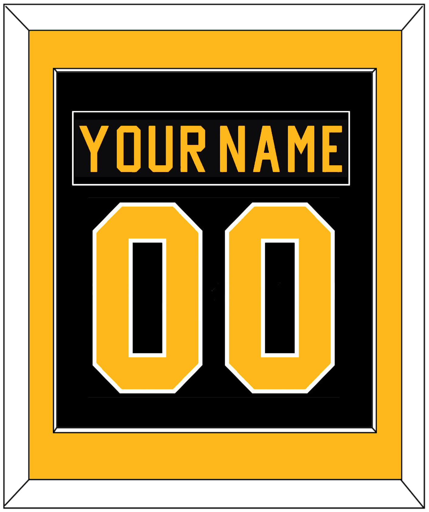 Pittsburgh Road Black Jersey (1981 Through 1984) Nameplate & Number (From The Back Of The Jersey). Single Mat Cut: Gold Mat With Black Nameplate And Gold Number Mounted On A Black Mat. Black Or White Frame.