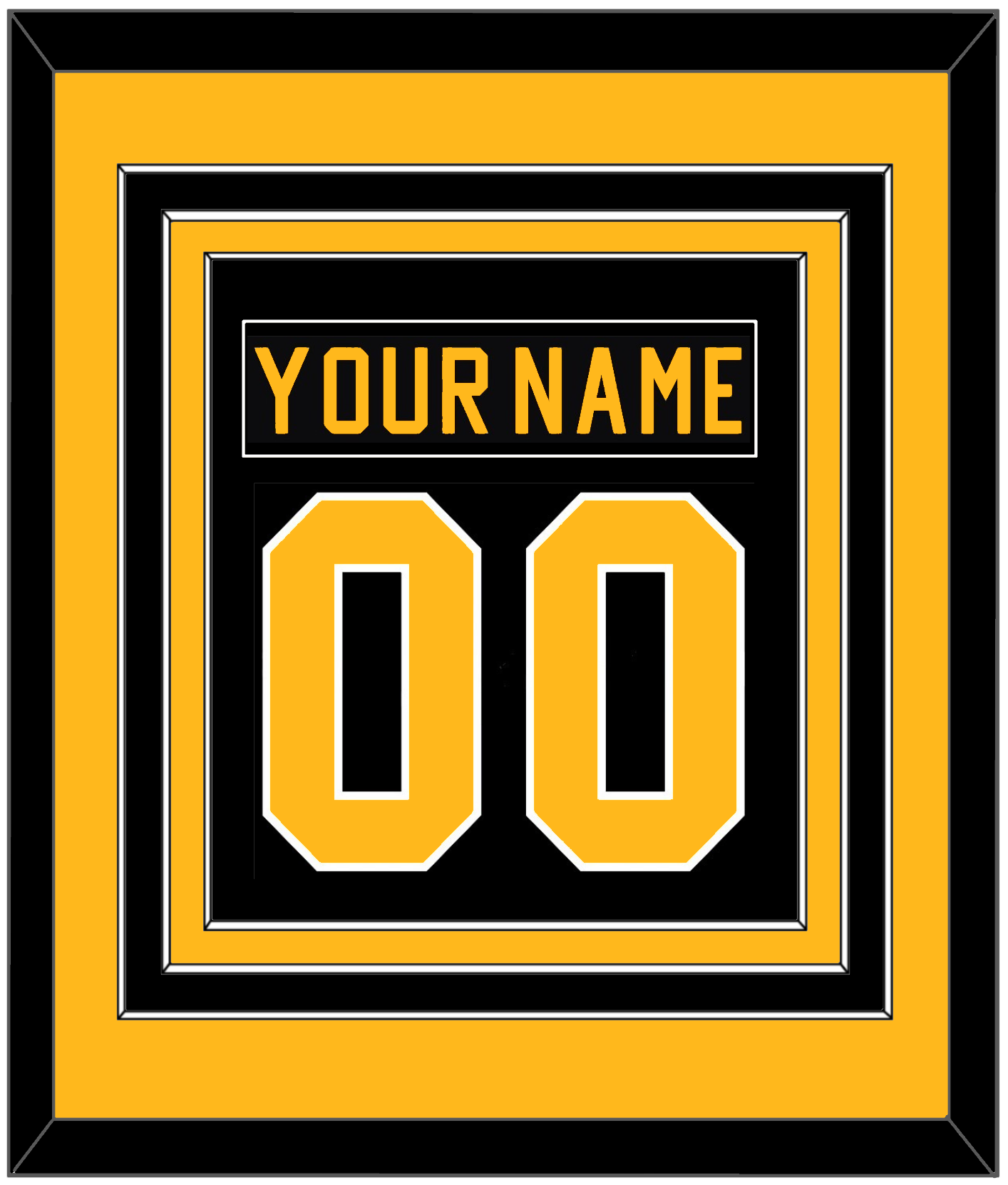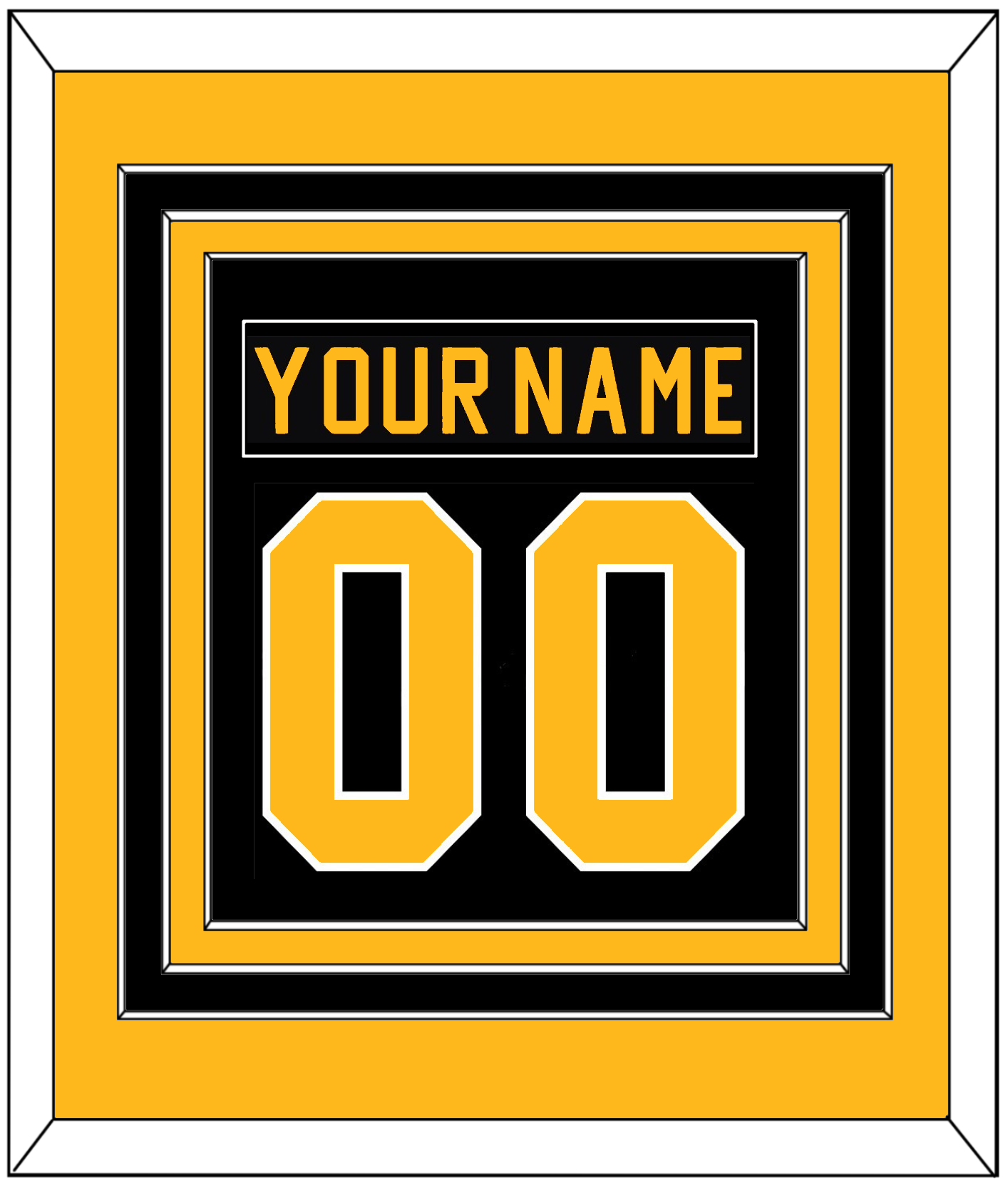 Pittsburgh Road Black Jersey (1981 Through 1984) Nameplate & Number (From The Back Of The Jersey).   Triple Mat Cut:  Gold Mat Over A Black Mat Over A Gold Mat.  Black Nameplate And Gold Number Mounted On A Black Mat.  Black Or White Frame.
