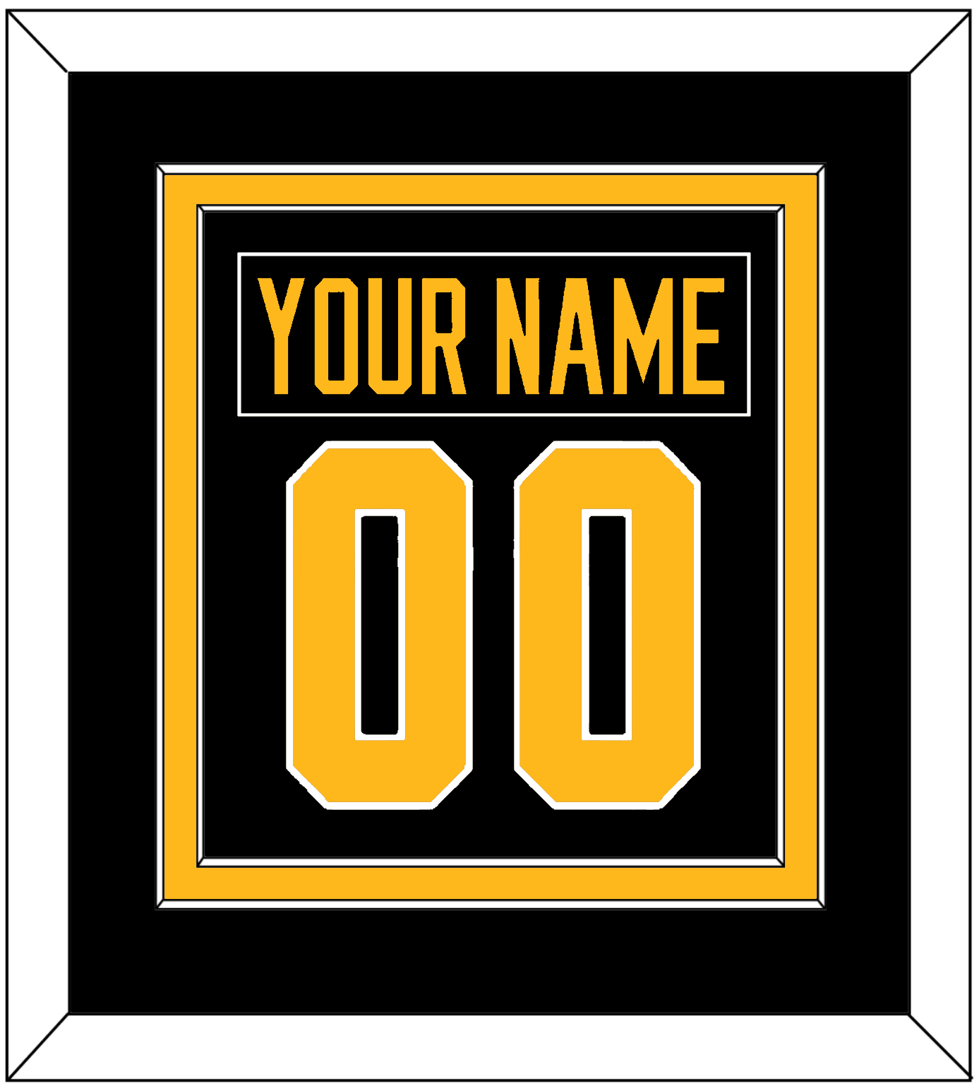 Pittsburgh Road Black Jersey (1988 Through 1992) Nameplate & Number (From The Back Of The Jersey). Double Mat Cut: Black Mat Over A Gold Mat. Black Nameplate And Gold Number Mounted On A Black Mat. White Frame.