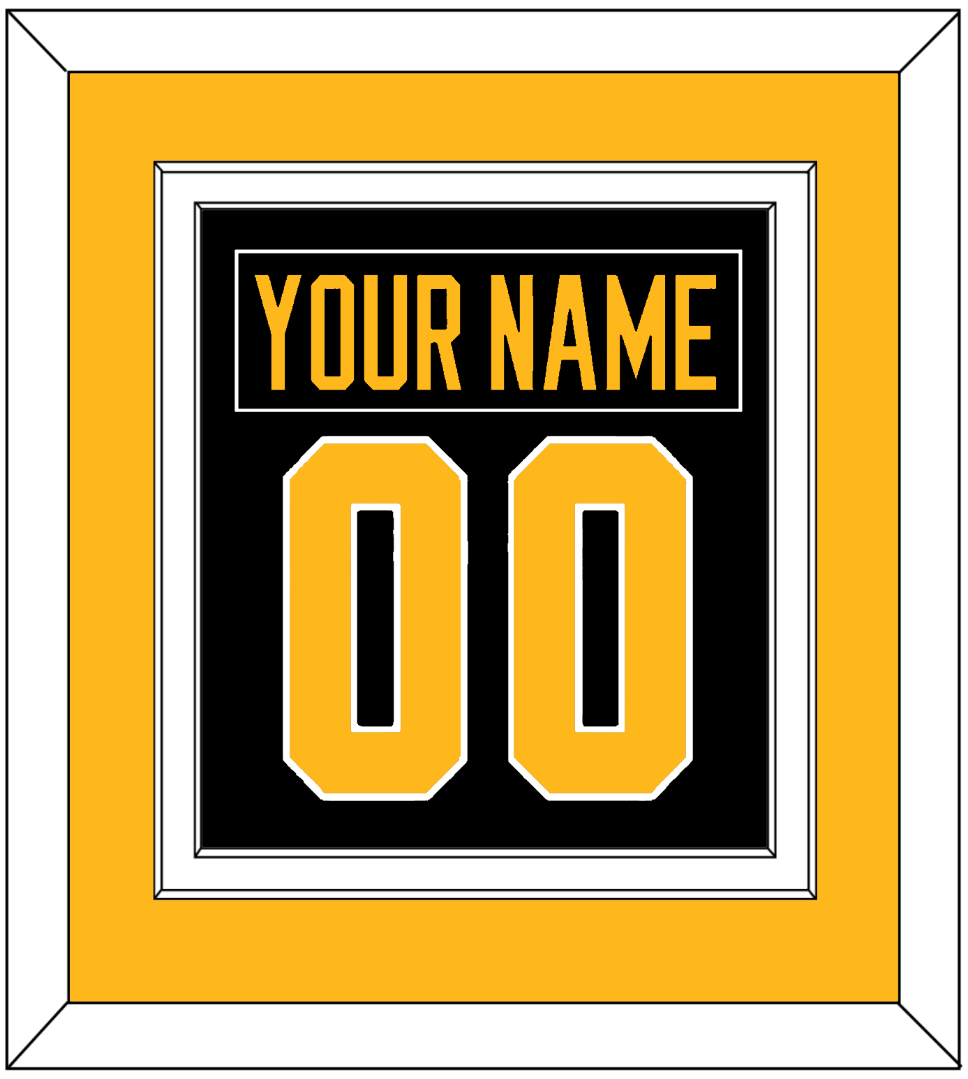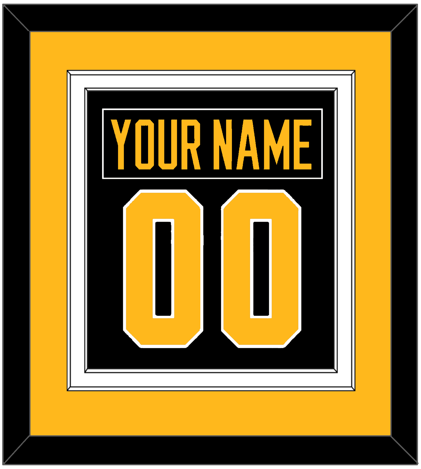 Pittsburgh Road Black Jersey (1988 Through 1992) Nameplate & Number (From The Back Of The Jersey). Double Mat Cut: Gold Mat Over A White Mat. Black Nameplate And Gold Number Mounted On A Black Mat. Black Or White Frame.