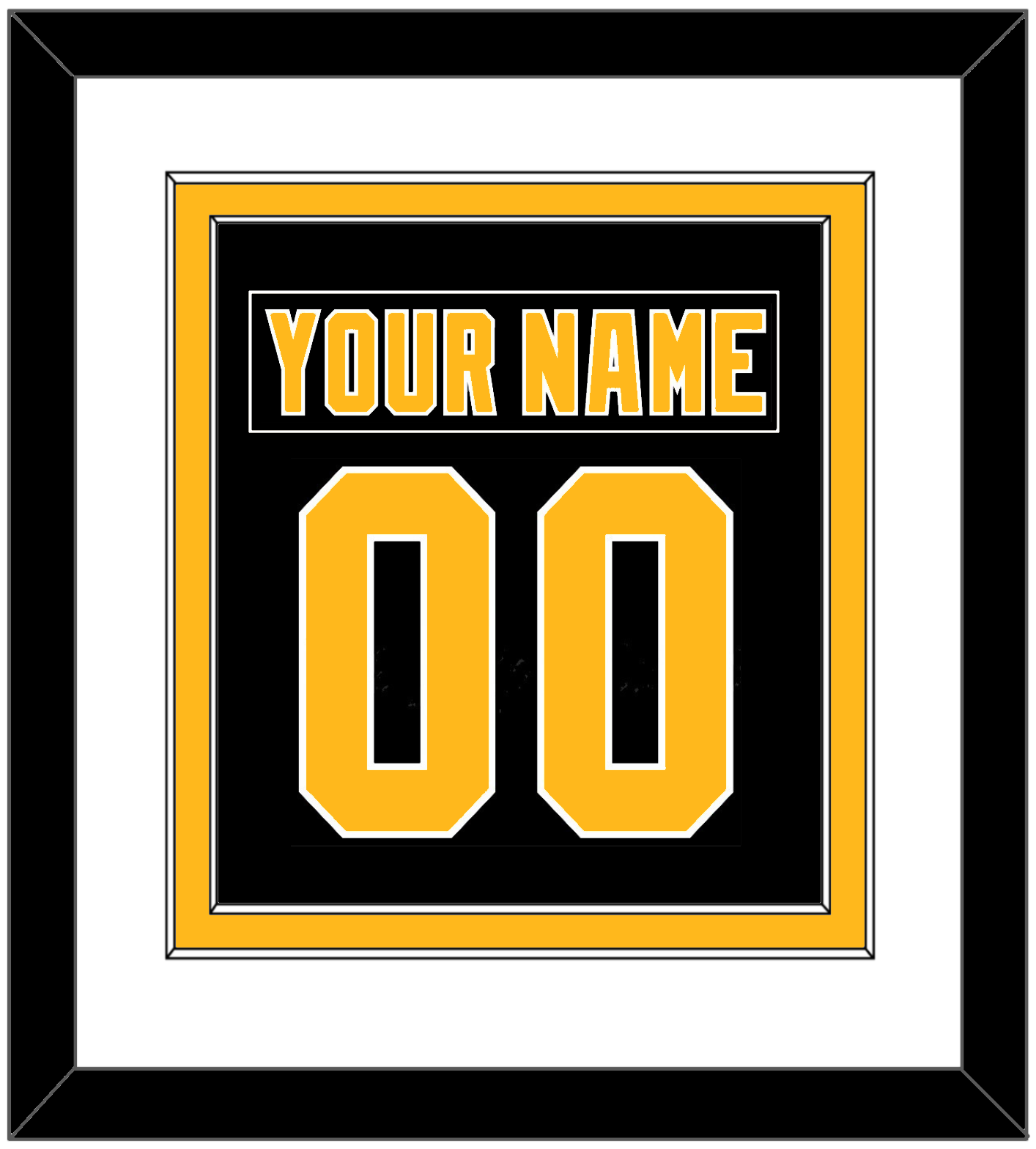 Pittsburgh Road Black Jersey (1992 Through 1997) Nameplate & Number (From The Back Of The Jersey). Double Mat Cut: White Mat Over A Gold Mat. Black Nameplate And Gold Number Mounted On A Black Mat. Black Frame.