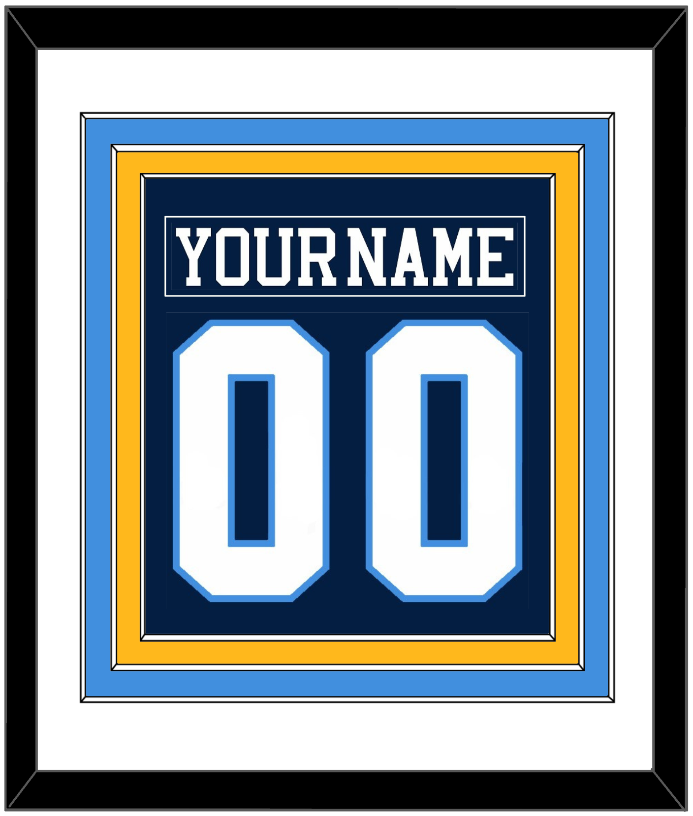 Pittsburgh Road Blue Jersey (1977 Through 1980) Nameplate & Number (From The Back Of The Jersey).   Triple Mat Cut:  White Mat Over A Powder Blue Mat Over A Gold Mat.  Blue Nameplate And White Number Mounted On A Blue Mat.  Black Frame.