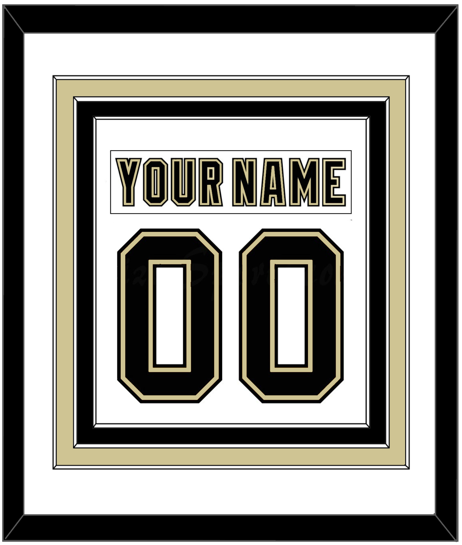 Pittsburgh Road/Home White Jersey (2002 Through 2007) Nameplate & Number (From The Back Of The Jersey). Double Mat Cut: White Mat Over A Gold Mat Over A Black Mat. White Nameplate And Black Number Mounted On A White Mat. Black Frame.