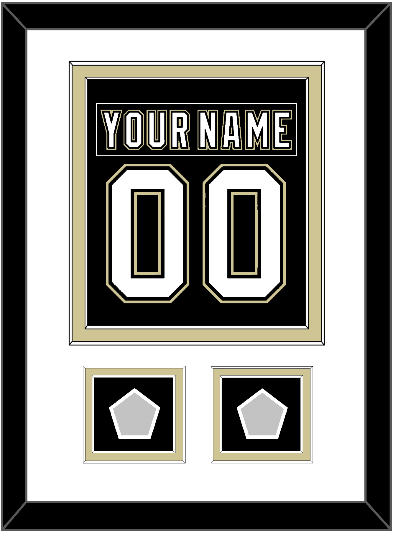 Pittsburgh Home Black Jersey (2007 Through 2016) Nameplate & Number (From The Back Of The Jersey) With 2 Stanley Cup Champions Patches: 1991 & 1992, 2009 & 2016 Or 2016 & 2017.  Double Mat Cut:  White Mat Over A Gold Mat.  Black Nameplate, White Number & Patches Mounted On A Black Mat.  Black Frame.