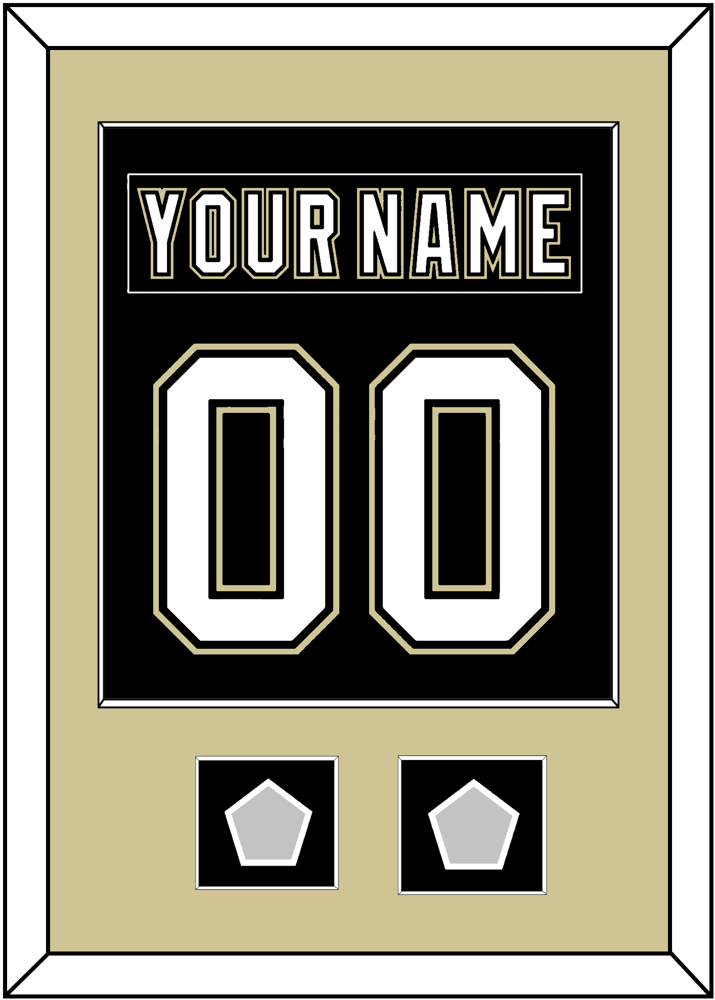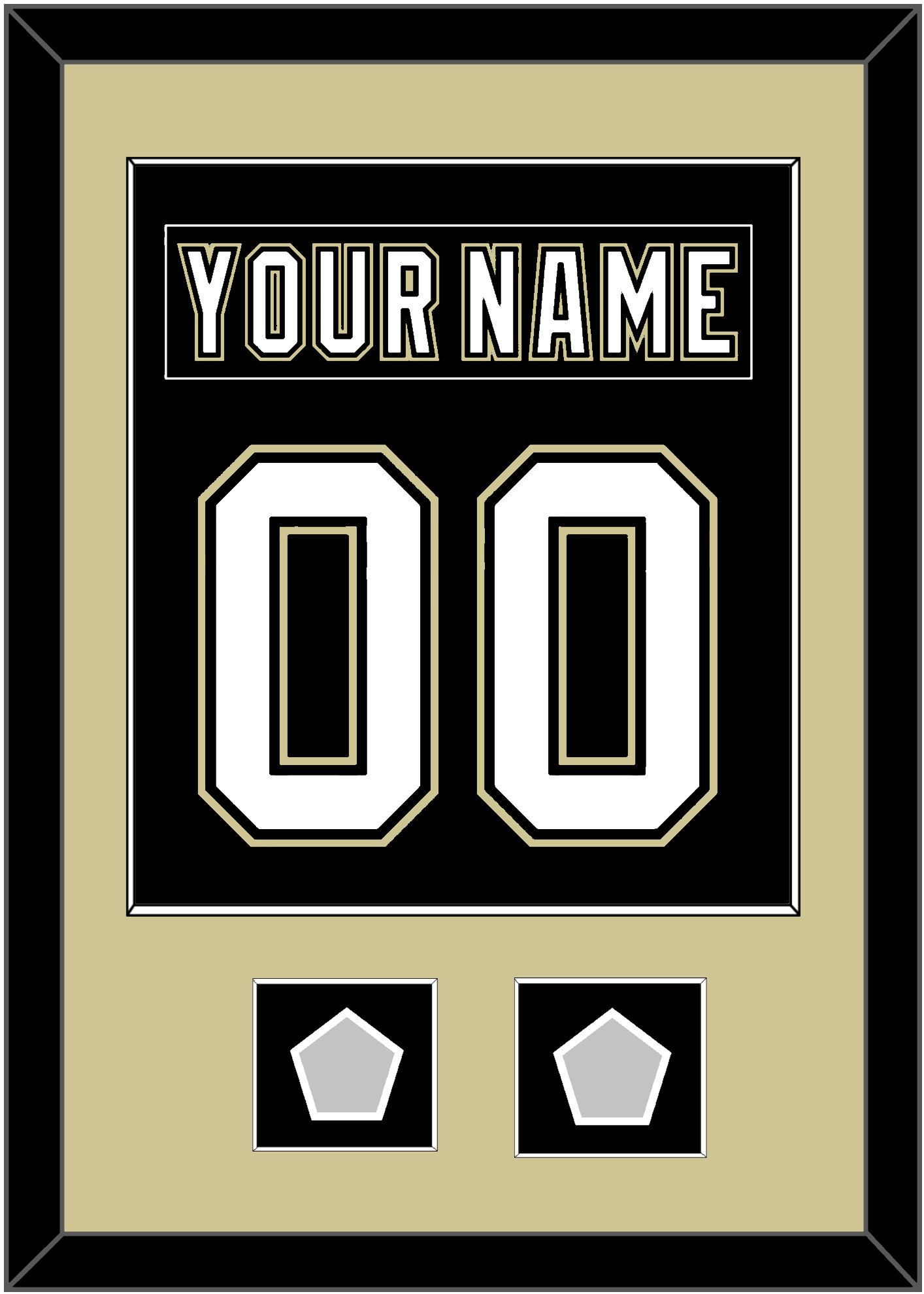 Pittsburgh Home Black Jersey (2007 Through 2016) Nameplate & Number (From The Back Of The Jersey) With 2 Stanley Cup Champions Patches: 1991 & 1992, 2009 & 2016 Or 2016 & 2017. Single Mat Cut: Gold Mat With Black Nameplate, Gold Number & Patches Mounted On A Black Mat. Black Or White Frame.