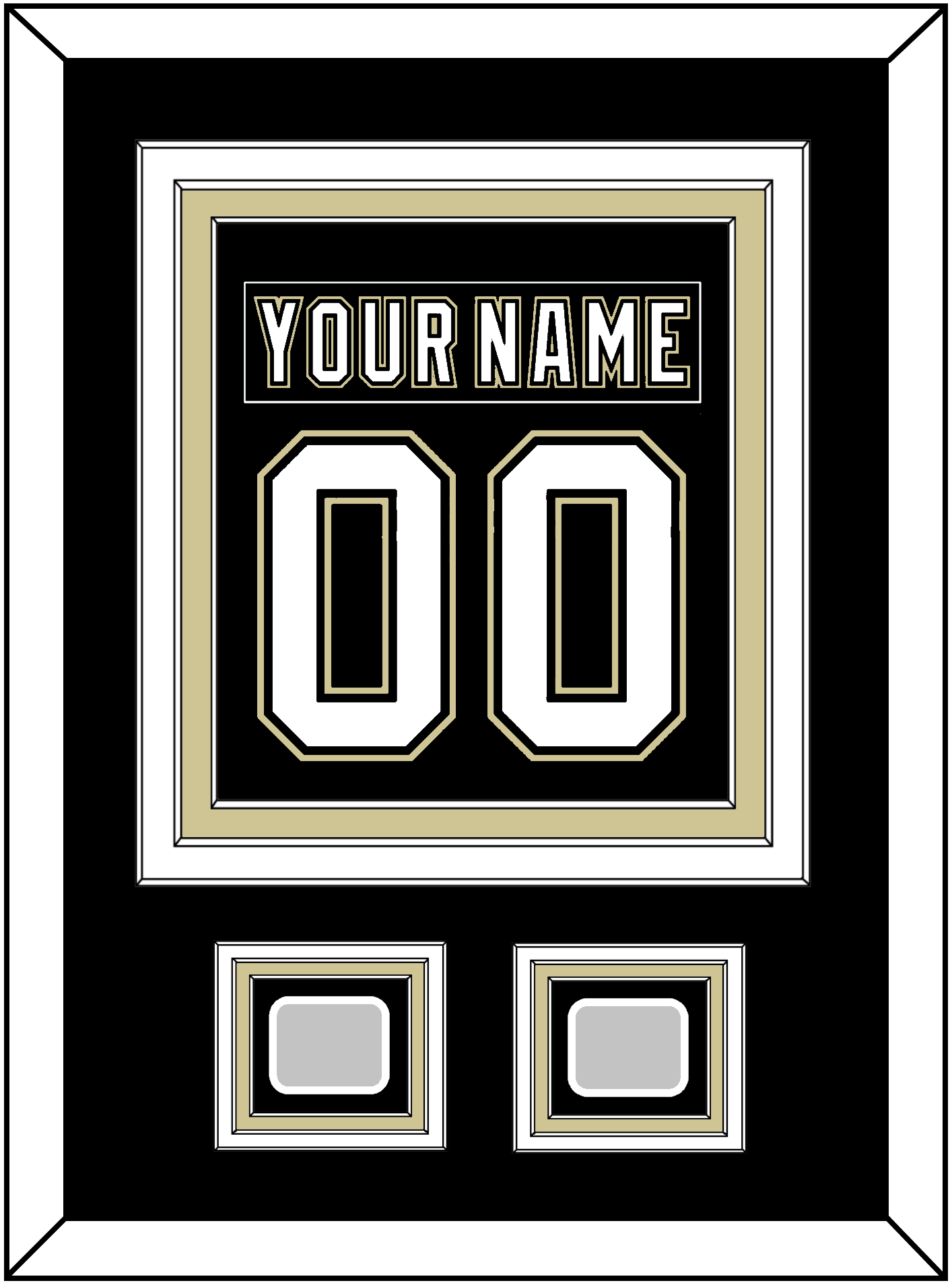 Pittsburgh Home Black Jersey (2007 Through 2016) Nameplate & Number (From The Back Of The Jersey) With 2 Stanley Cup Champions Patches: 1991 & 1992, 2009 & 2016 Or 2016 & 2017.  Triple Mat Cut:  Black Mat Over A White Mat Over A Gold Mat.  Black Nameplate, White Number & Patches Mounted On A Black Mat.  White Frame.