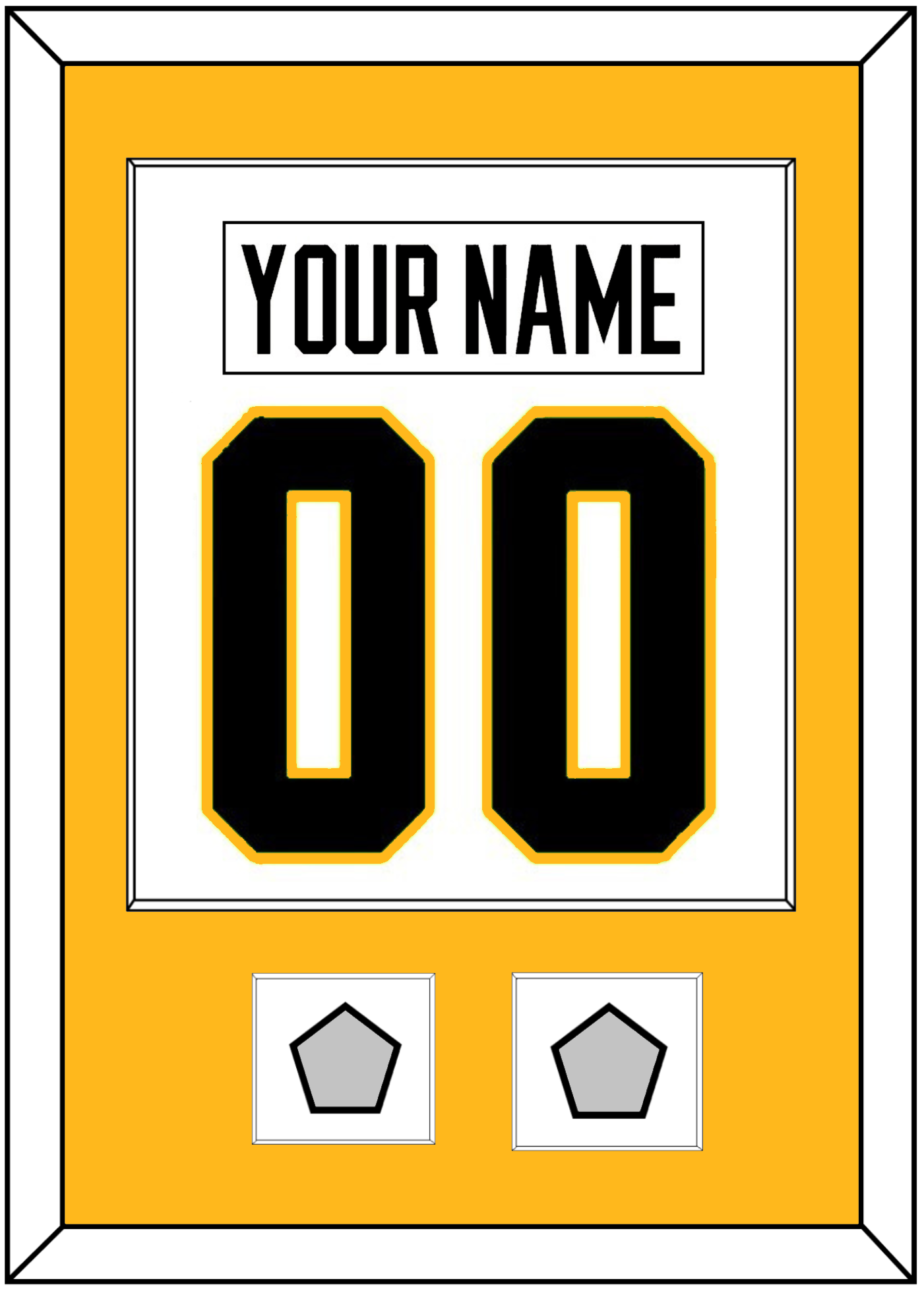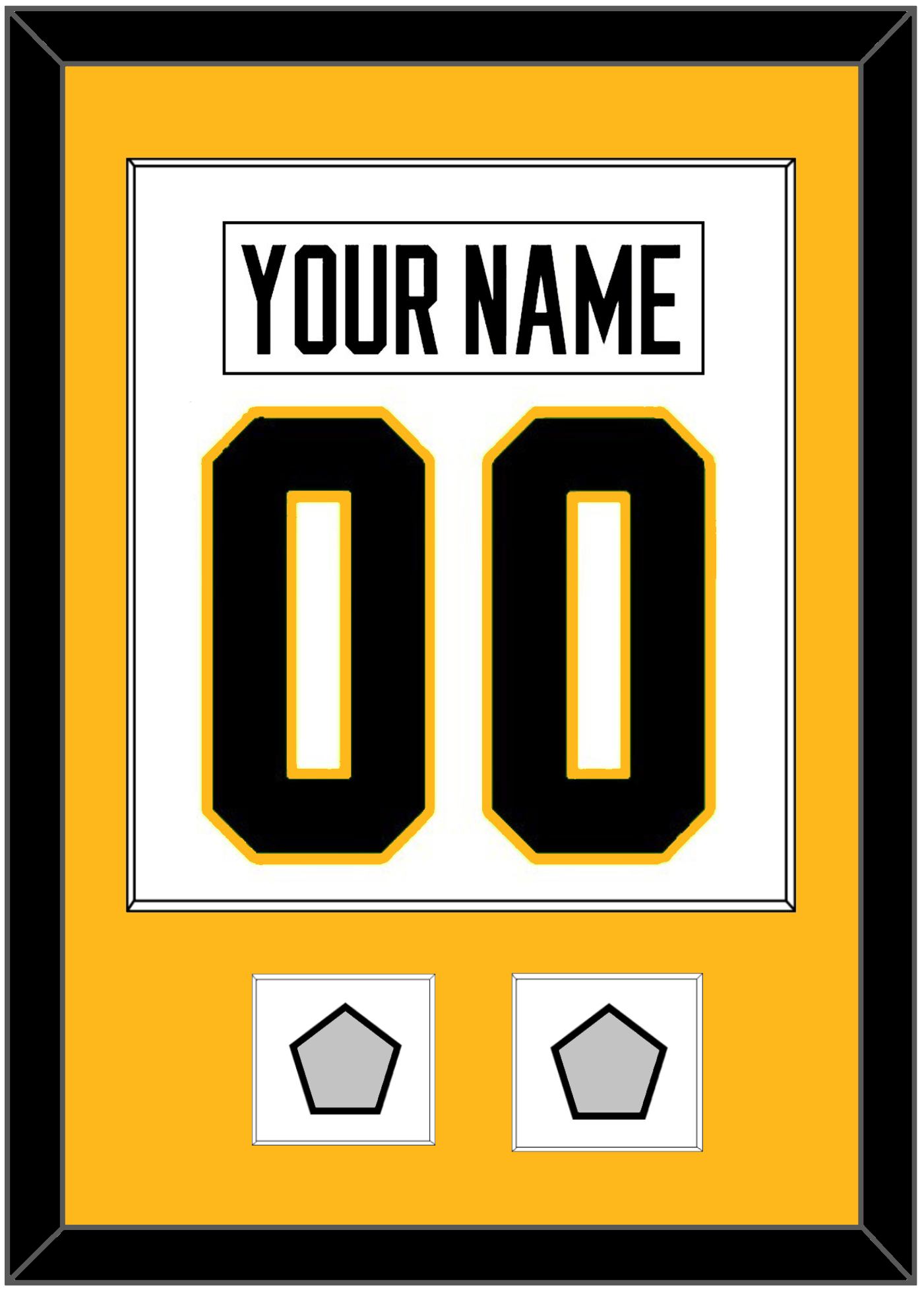 Pittsburgh Home White Jersey (1988 Through 1992) Nameplate & Number (From The Back Of The Jersey) With 2 Stanley Cup Champions Patches: 1991 & 1992, 2009 & 2016 Or 2016 & 2017. Single Mat Cut: Gold Mat With White Nameplate, Black Number & Patches Mounted On A White Mat. Black Or White Frame.