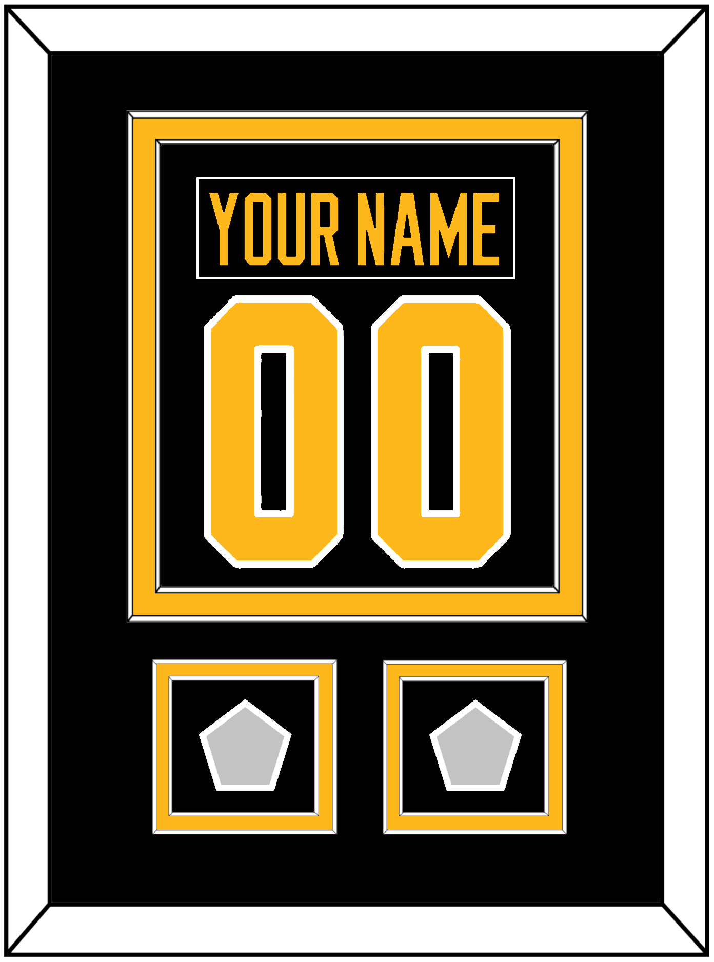 Pittsburgh Road Black Jersey (1988 Through 1992) Nameplate & Number (From The Back Of The Jersey) With 2 Stanley Cup Champions Patches: 1991 & 1992, 2009 & 2016 Or 2016 & 2017. Double Mat Cut: Black Mat Over A Gold Mat. Black Nameplate, Gold Number & Patches Mounted On A Black Mat. White Frame.