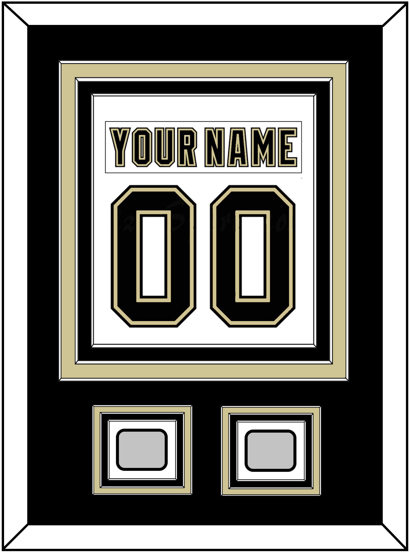 Pittsburgh Road White Jersey (2007 Through 2016) Nameplate & Number (From The Back Of The Jersey) With 2 Stanley Cup Champions Patches: 1991 & 1992, 2009 & 2016 Or 2016 & 2017.  Triple Mat Cut:  Black Mat Over A Gold Mat Over A Black Mat.  White Nameplate, Black Number & Patches Mounted On A White Mat.  White Frame.