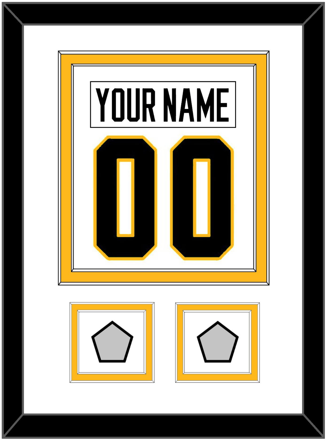 Pittsburgh Road White Jersey Nameplate & Number (From The Back Of The Jersey) With 2 Stanley Cup Champions Patches: 1991 & 1992, 2009 & 2016 Or 2016 & 2017. Double Mat Cut: White Mat Over A Gold Mat. White Nameplate, Black Number & Patches Mounted On A White Mat. Black Frame.