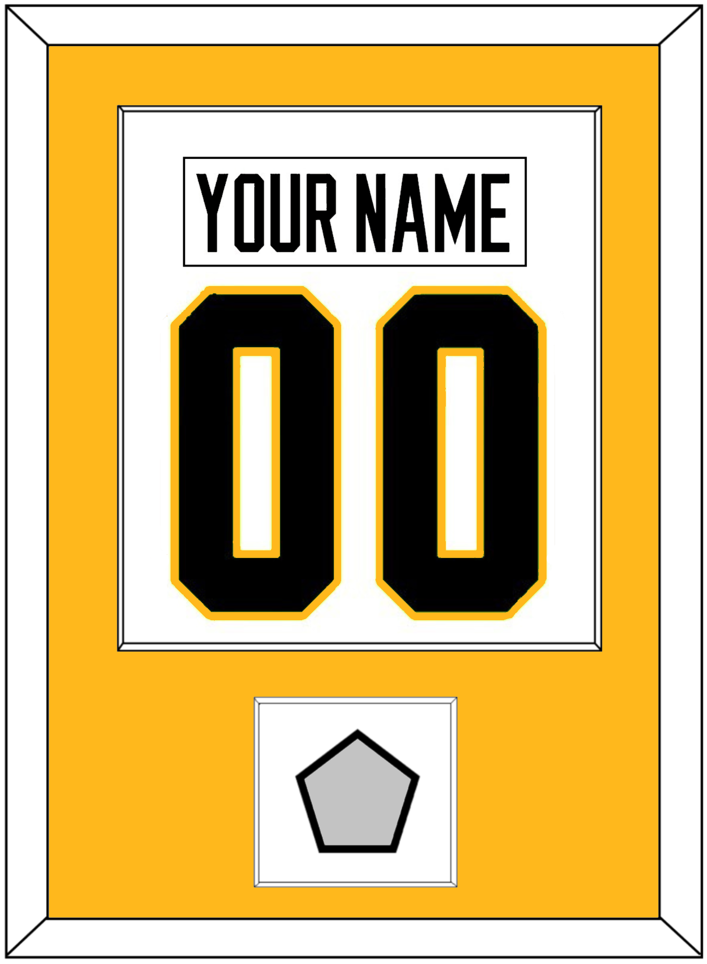 Pittsburgh Road White Jersey Nameplate & Number (From The Back Of The Jersey) With 2 Stanley Cup Champions Patches: 1991 & 1992, 2009 & 2016 Or 2016 & 2017.  Single Mat Cut:  Gold Mat With White Nameplate, Black Number & Patches Mounted On A White Mat.  Black Or White Frame.