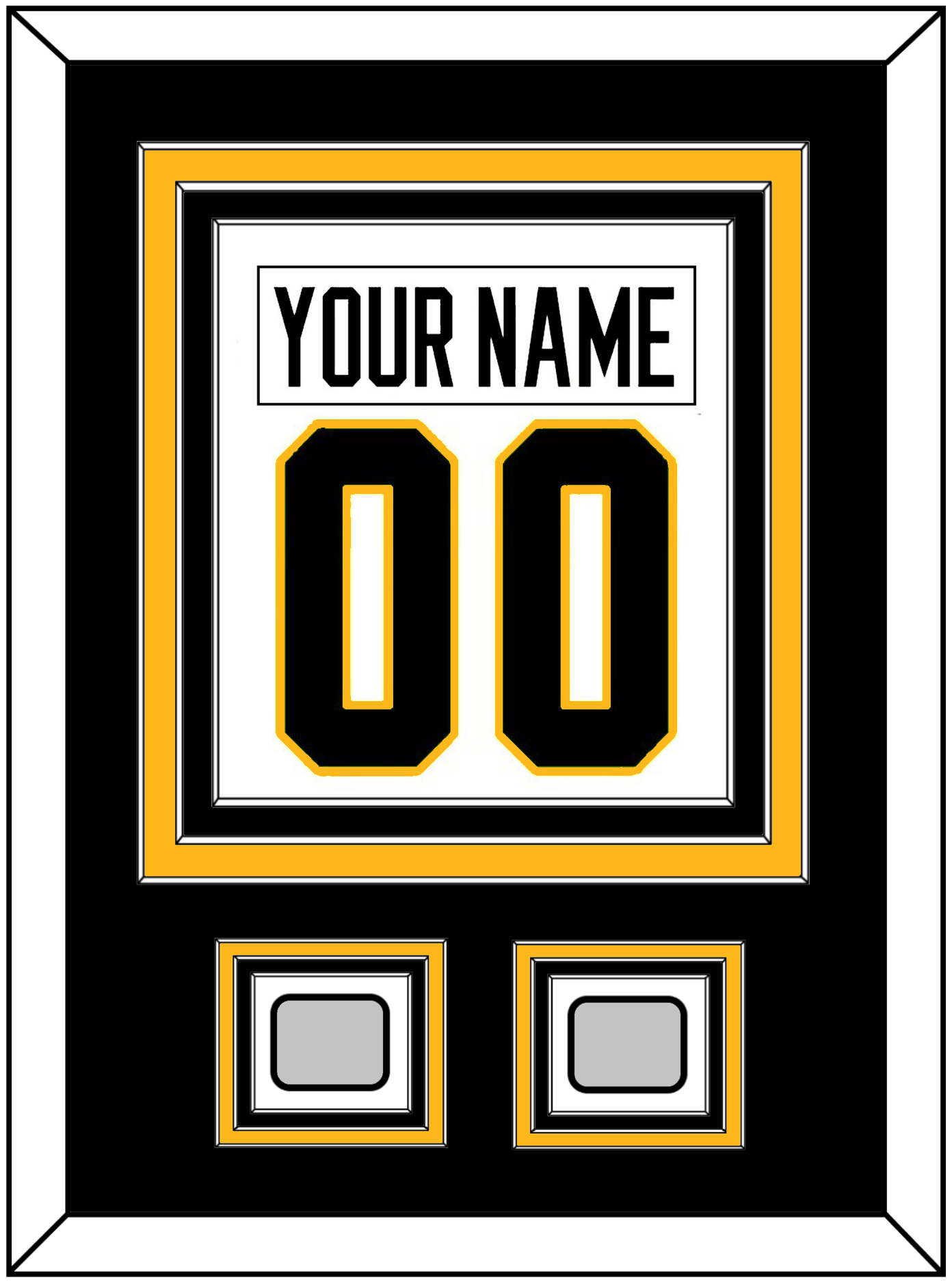Pittsburgh Road White Jersey Nameplate & Number (From The Back Of The Jersey) With 2 Stanley Cup Champions Patches: 1991 & 1992, 2009 & 2016 Or 2016 & 2017. Triple Mat Cut: Black Mat Over A Gold Mat Over A Black Mat. White Nameplate, Black Number & Patches Mounted On A White Mat. White Frame.
