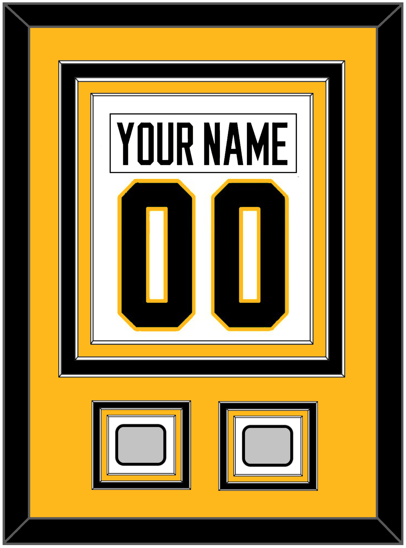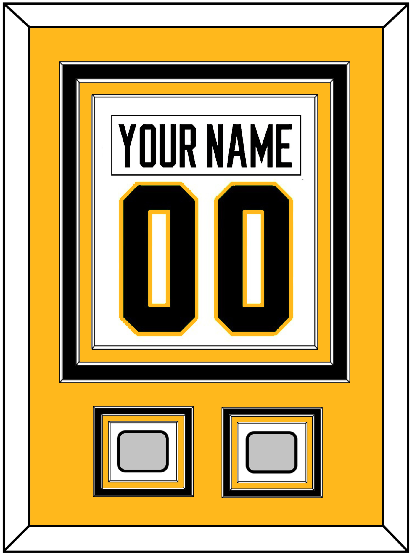 Pittsburgh Road White Jersey Nameplate & Number (From The Back Of The Jersey) With 2 Stanley Cup Champions Patches: 1991 & 1992, 2009 & 2016 Or 2016 & 2017. Triple Mat Cut: Gold Mat Over A Black Mat Over A Gold Mat. White Nameplate, Black Number & Patches Mounted On A White Mat. Black Or White Frame.
