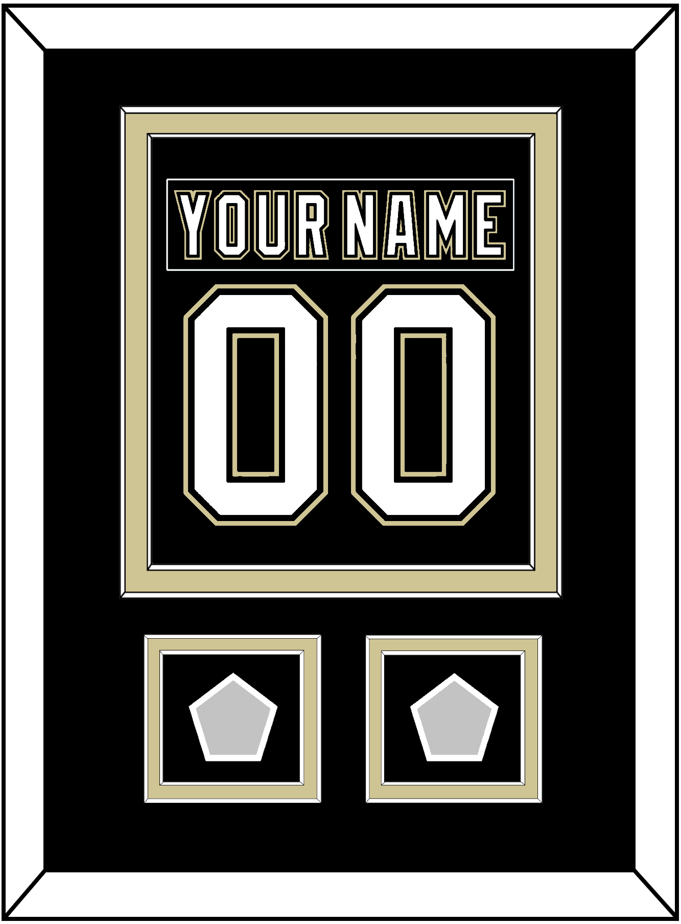 Pittsburgh Home Black Jersey (2007 Through 2016) Nameplate & Number (From The Back Of The Jersey) With 2 Stanley Cup Finals Patches: 1991 & 1992, 2009 & 2016 Or 2016 & 2017. Double Mat Cut: Black Mat Over A Gold Mat. Black Nameplate, White Number & Patches Mounted On A Black Mat. White Frame.