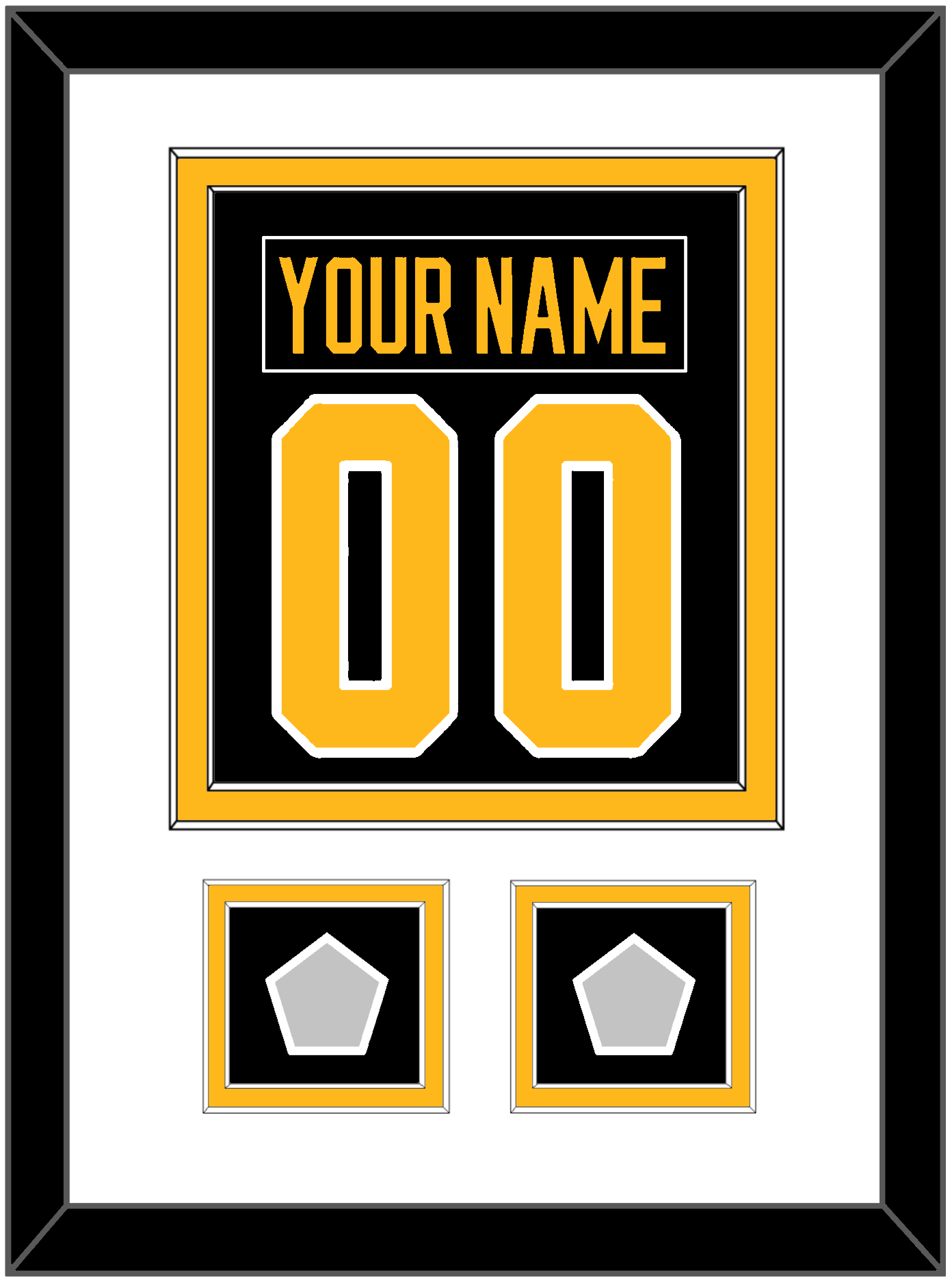 Pittsburgh Home Black Jersey Nameplate & Number (From The Back Of The Jersey) With 2 Stanley Cup Finals Patches: 1991 & 1992, 2009 & 2016 Or 2016 & 2017. Double Mat Cut: White Mat Over A Gold Mat. Black Nameplate, Gold Number & Patches Mounted On A Black Mat. Black Frame.