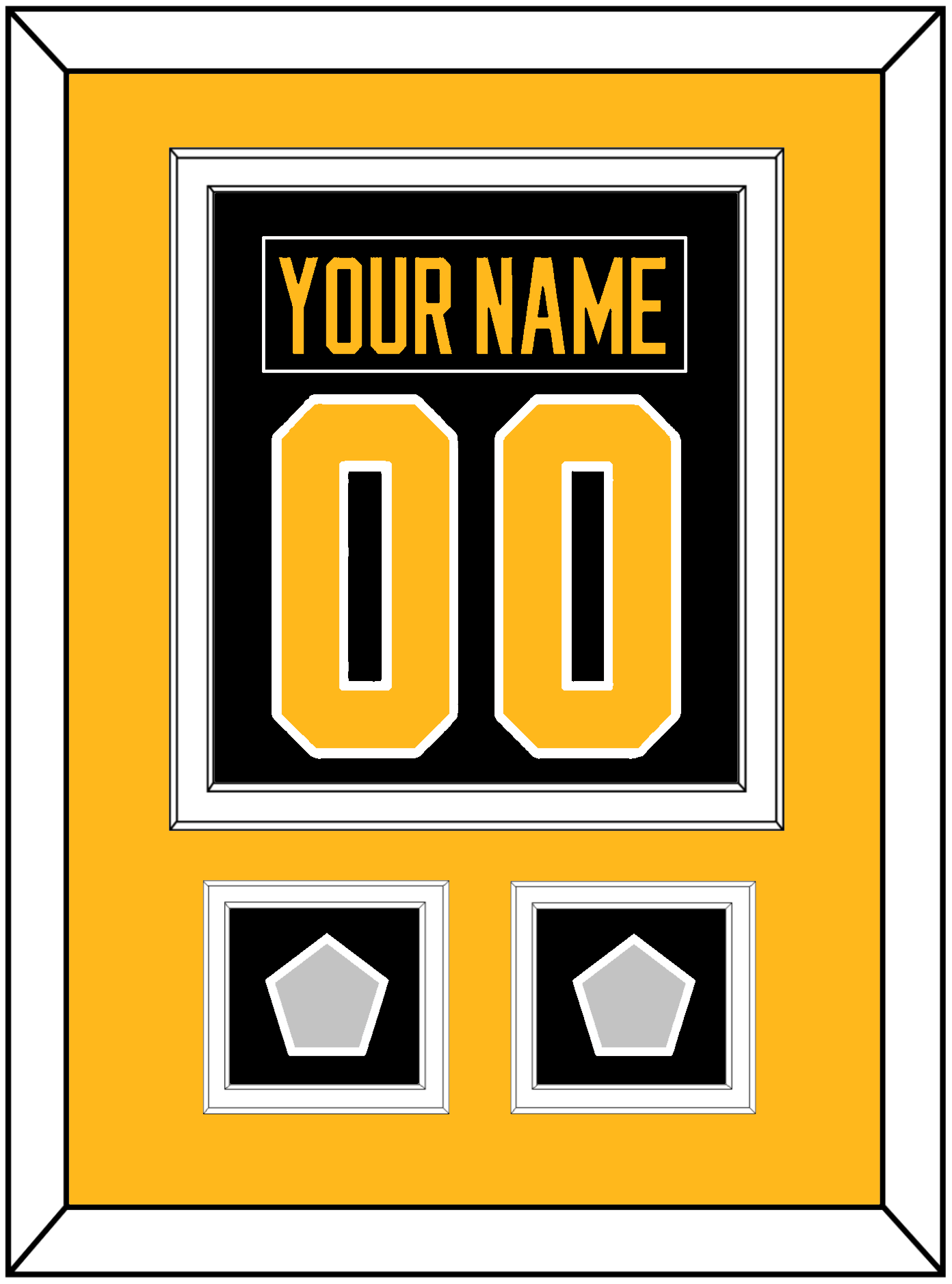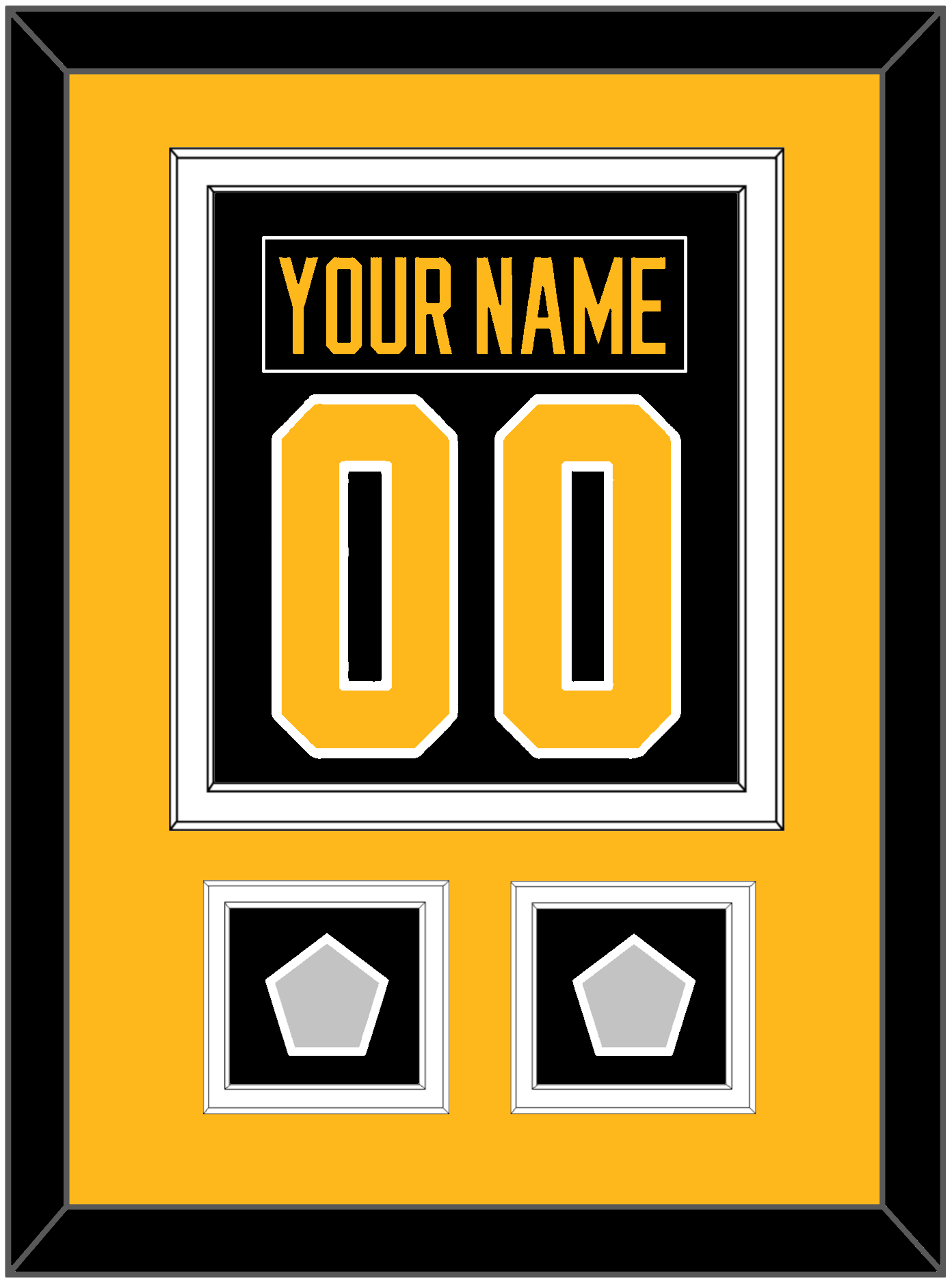 Pittsburgh Home Black Jersey Nameplate & Number (From The Back Of The Jersey) With 2 Stanley Cup Finals Patches: 1991 & 1992, 2009 & 2016 Or 2016 & 2017. Double Mat Cut: Gold Mat Over A White Mat. Black Nameplate, Gold Number & Patches Mounted On A Black Mat. Black Or White Frame.