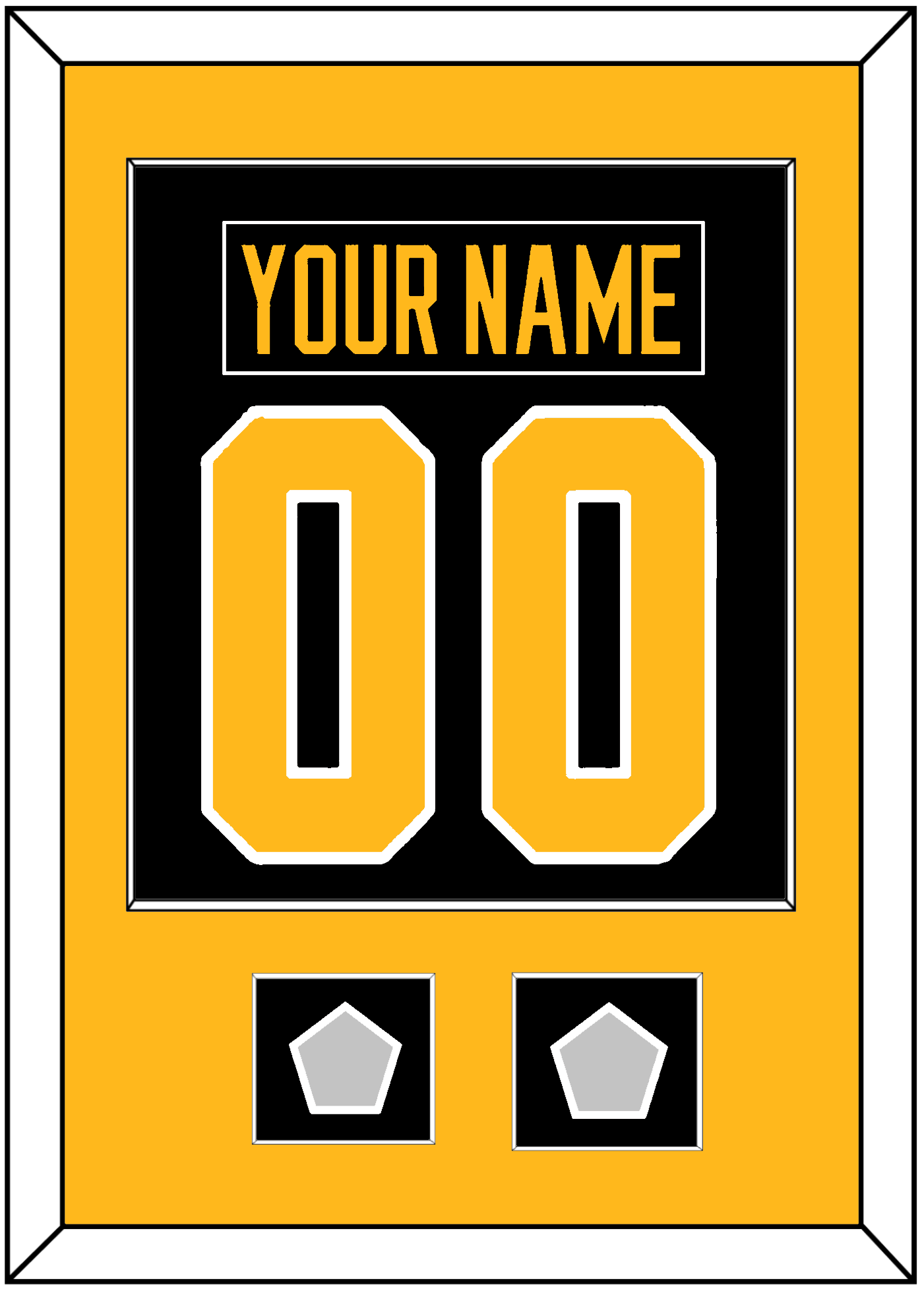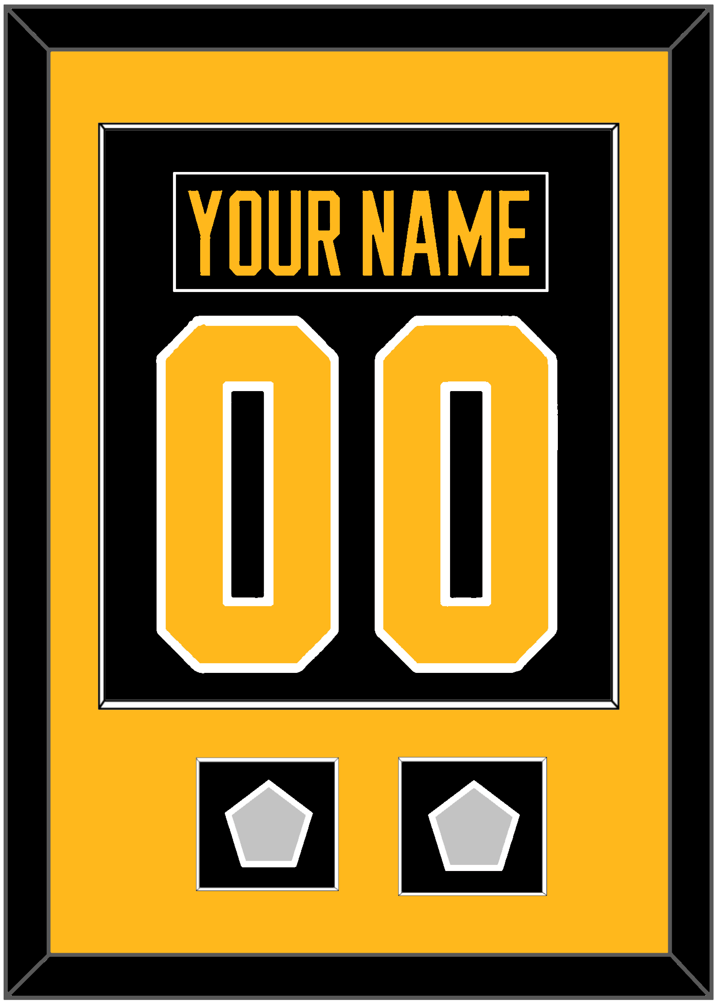Pittsburgh Home Black Jersey Nameplate & Number (From The Back Of The Jersey) With 2 Stanley Cup Finals Patches: 1991 & 1992, 2009 & 2016 Or 2016 & 2017. Single Mat Cut: Gold Mat With Black Nameplate, Gold Number & Patches Mounted On A Black Mat. Black Or White Frame.