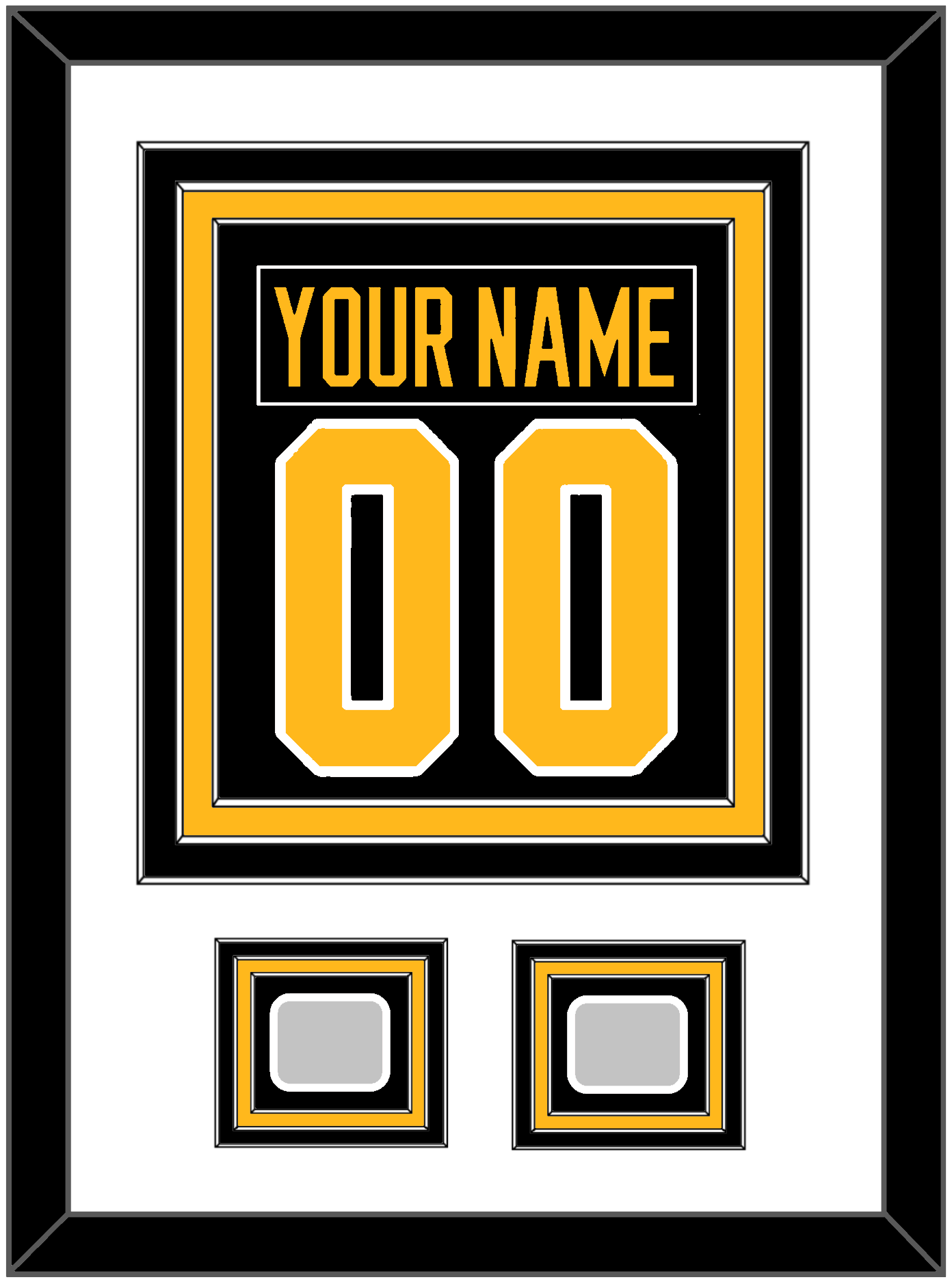 Pittsburgh Home Black Jersey Nameplate & Number (From The Back Of The Jersey) With 2 Stanley Cup Finals Patches: 1991 & 1992, 2009 & 2016 Or 2016 & 2017. Triple Mat Cut: White Mat Over A Black Mat Over A Gold Mat. Black Nameplate, Gold Number & Patches Mounted On A Black Mat. Black Frame.
