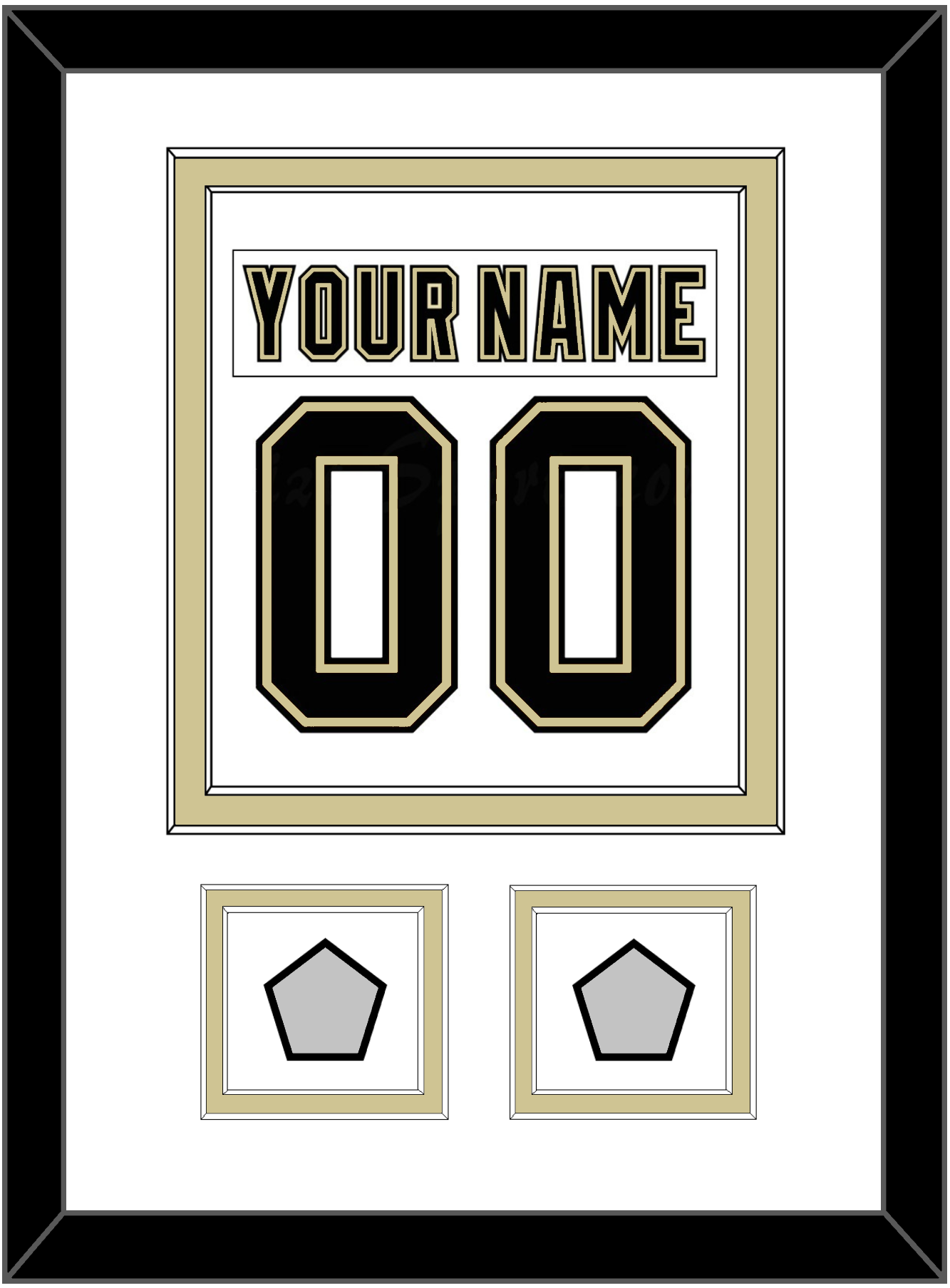 Pittsburgh Road White Jersey (2007 Through 2016) Nameplate & Number (From The Back Of The Jersey) With 2 Stanley Cup Finals Patches: 1991 & 1992, 2009 & 2016 Or 2016 & 2017. Double Mat Cut: White Mat Over A Gold Mat. White Nameplate, Black Number & Patches Mounted On A White Mat. Black Frame.