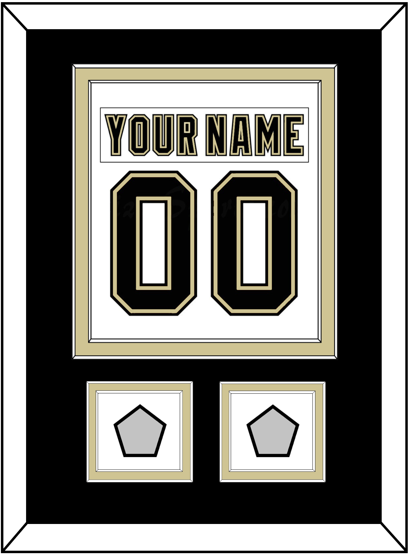 Pittsburgh Road White Jersey (2007 Through 2016) Nameplate & Number (From The Back Of The Jersey) With 2 Stanley Cup Finals Patches: 1991 & 1992, 2009 & 2016 Or 2016 & 2017. Double Mat Cut: Black Mat Over A Gold Mat. White Nameplate, Black Number & Patches Mounted On A White Mat. White Frame.