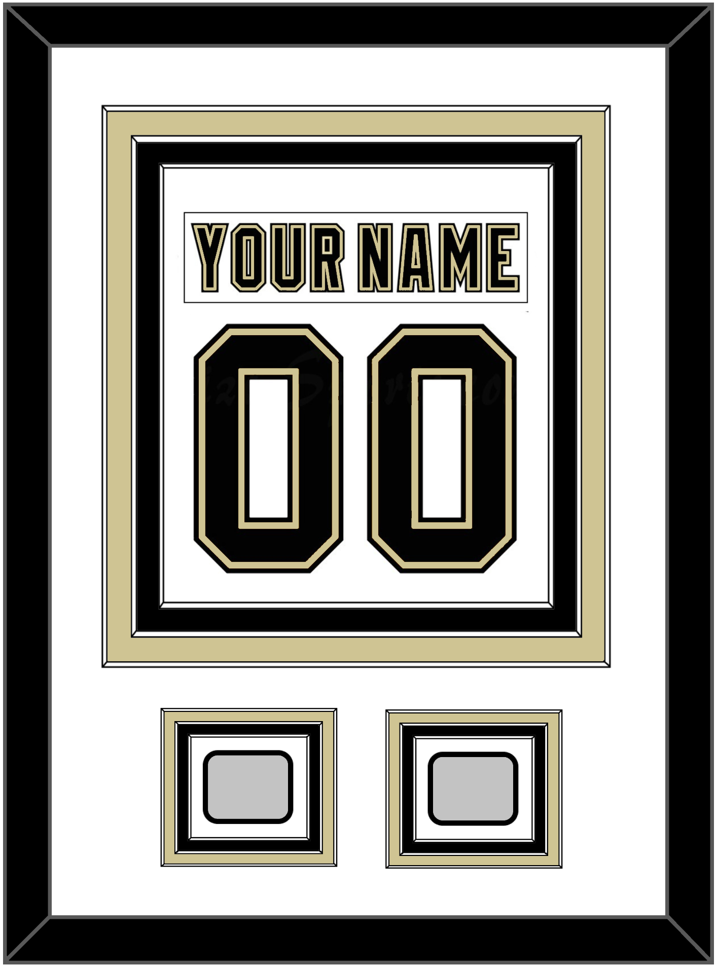 Pittsburgh Road White Jersey (2007 Through 2016) Nameplate & Number (From The Back Of The Jersey) With 2 Stanley Cup Finals Patches: 1991 & 1992, 2009 & 2016 Or 2016 & 2017. Triple Mat Cut: White Mat Over A Gold Mat Over A Black Mat. White Nameplate, Black Number & Patches Mounted On A White Mat. Black Frame.