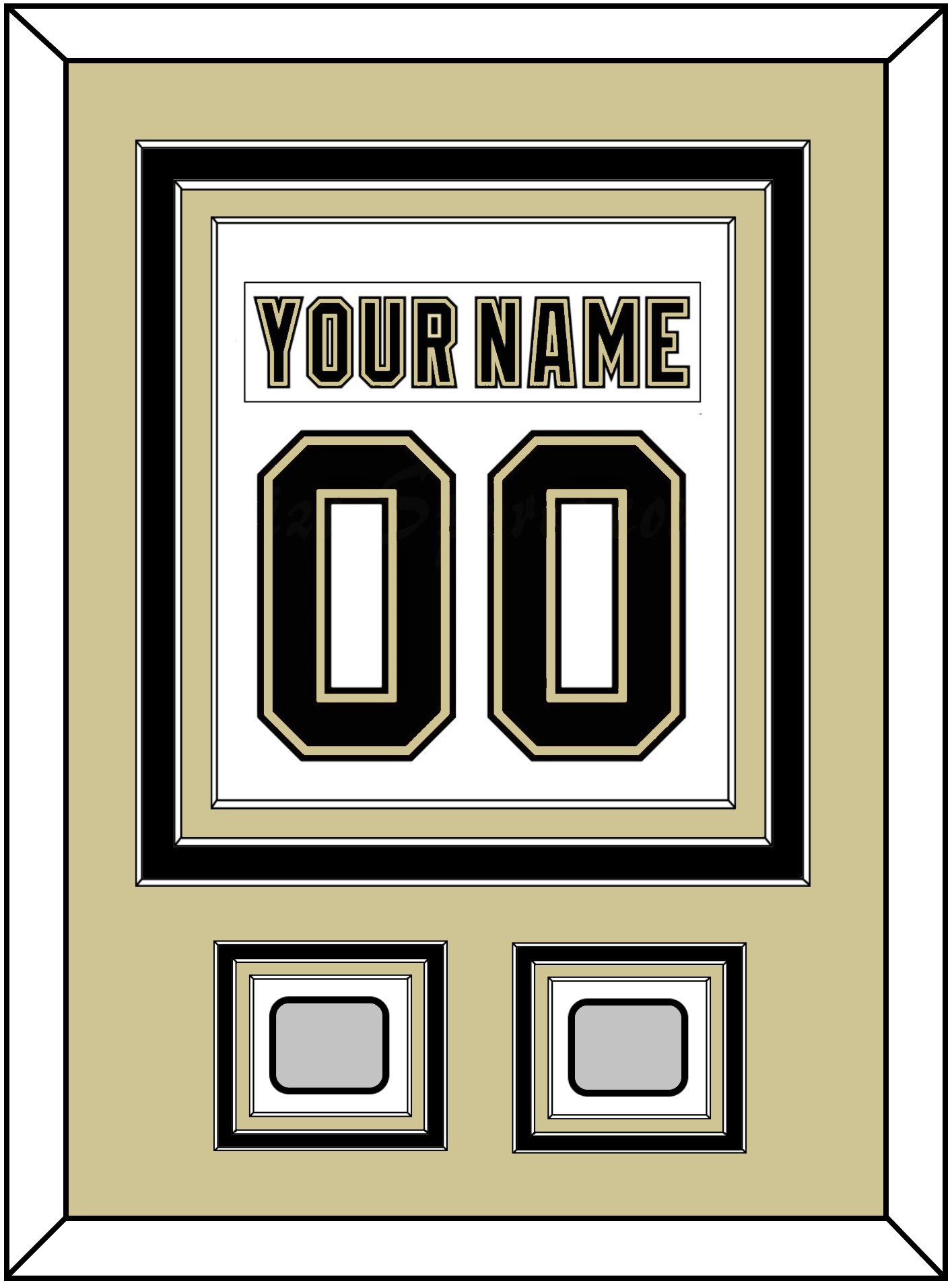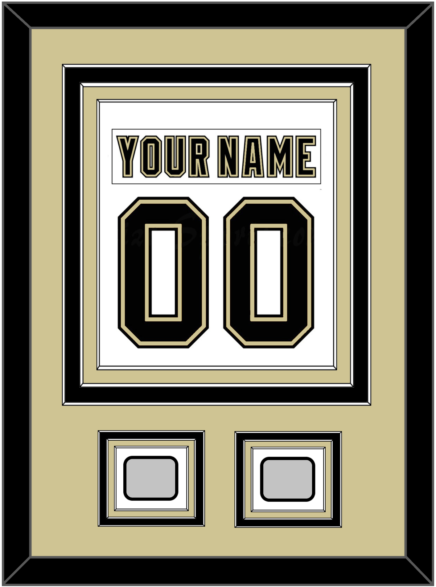 Pittsburgh Road White Jersey (2007 Through 2016) Nameplate & Number (From The Back Of The Jersey) With 2 Stanley Cup Finals Patches: 1991 & 1992, 2009 & 2016 Or 2016 & 2017. Triple Mat Cut: Gold Mat Over A Black Mat Over A Gold Mat. White Nameplate, Black Number & Patches Mounted On A White Mat. Black Or White Frame.