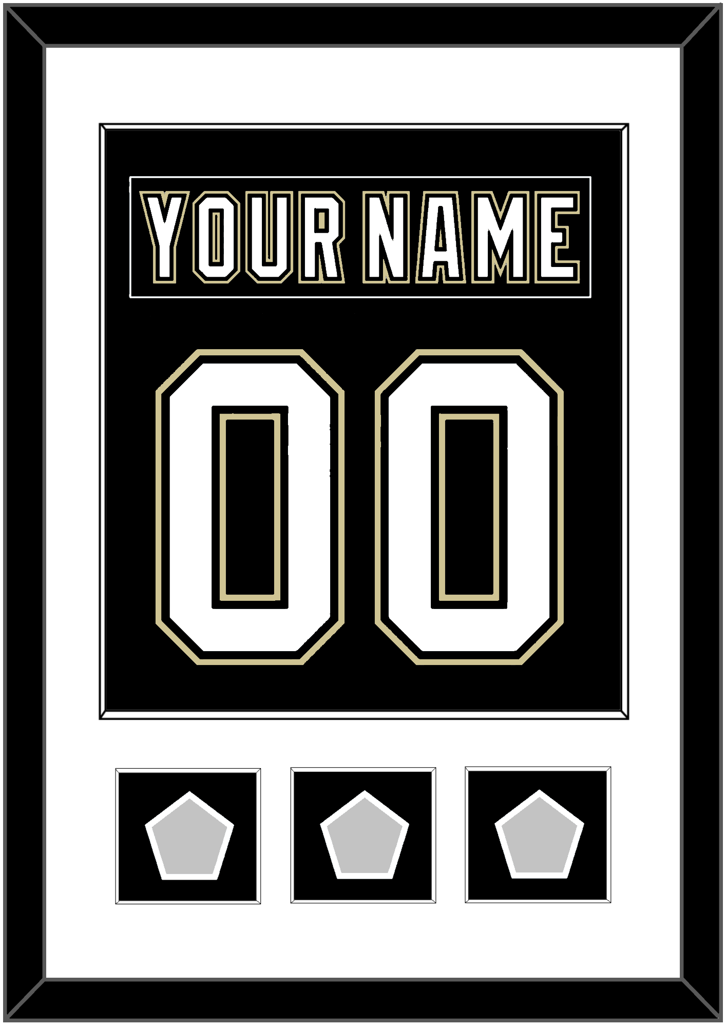 Pittsburgh Home Black Jersey (2007 Through 2016) Nameplate & Number (From The Back Of The Jersey) With 3 Stanley Cup Finals Patches: 2009, 2016 & 2017. Single Mat Cut: White Mat With Black Nameplate, White Number & Patches Mounted On A Black Mat. Black Frame.