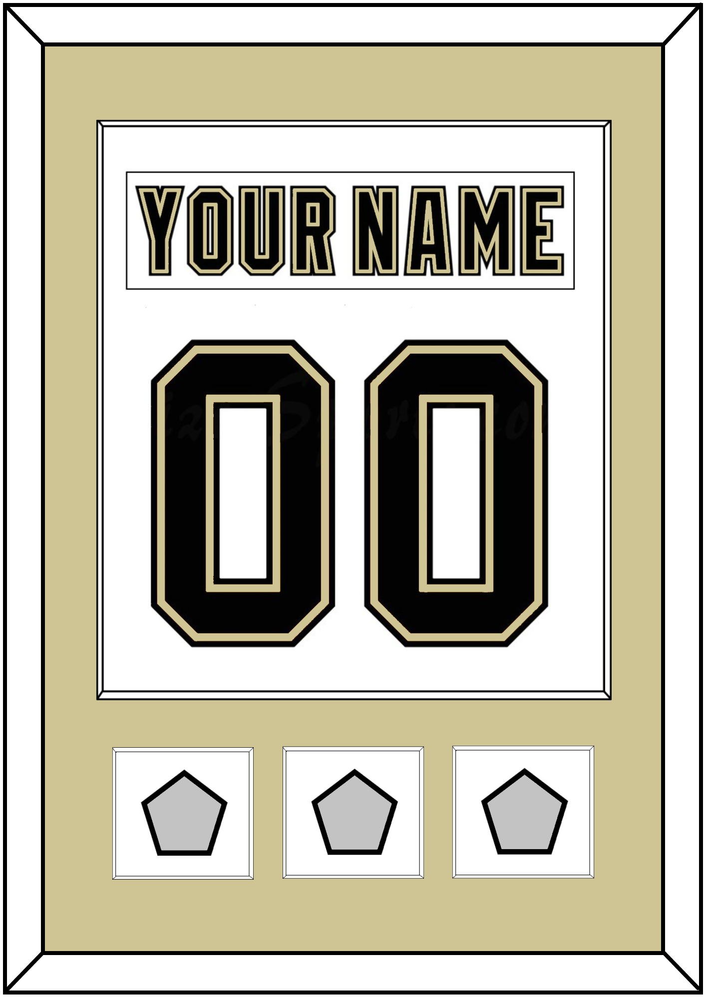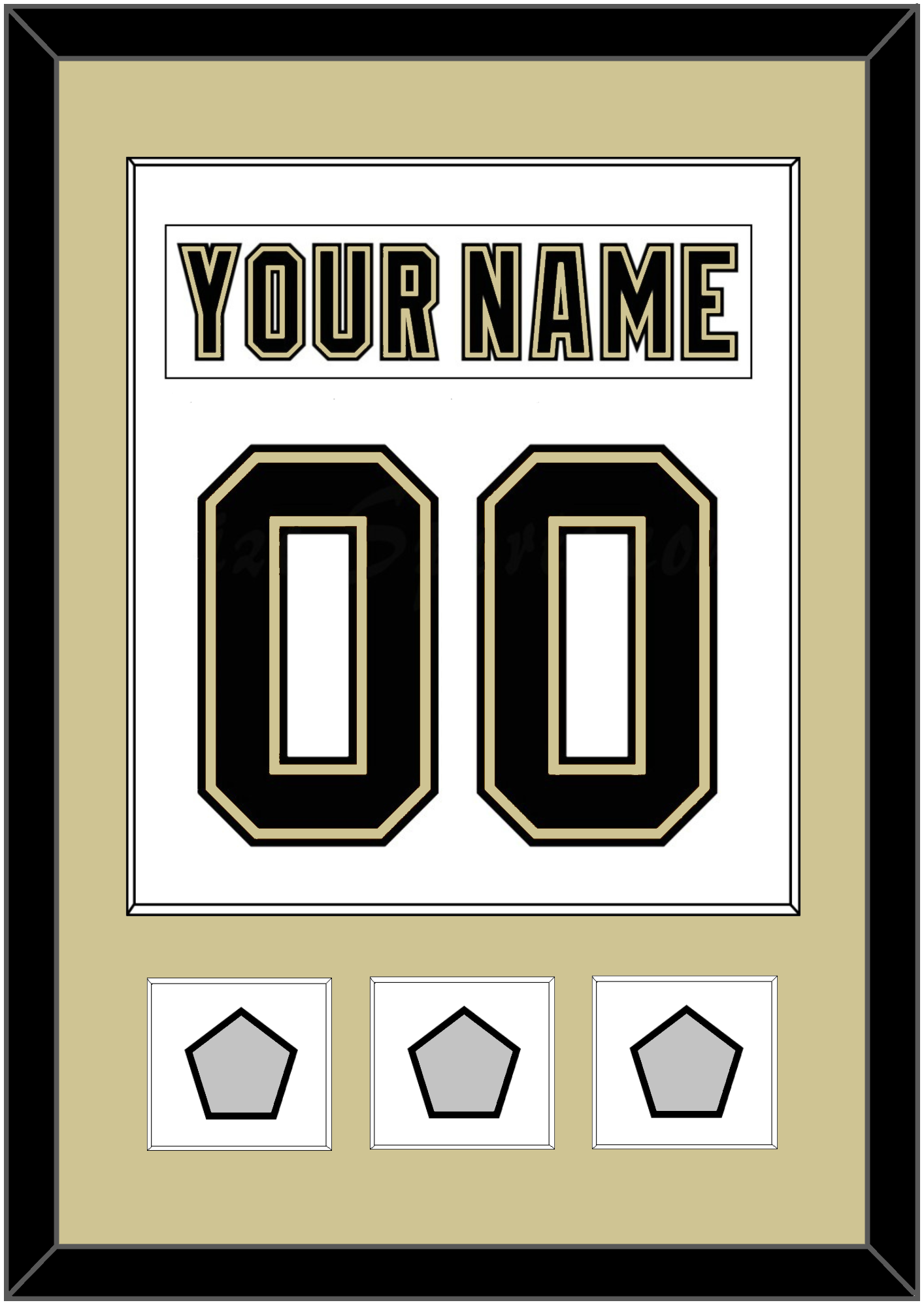 Pittsburgh Road White Jersey (2007 Through 2016) Nameplate & Number (From The Back Of The Jersey) With 3 Stanley Cup Finals Patches: 2009, 2016 & 2017.  Single Mat Cut:  Gold Mat With White Nameplate, Black Number & Patches Mounted On A White Mat.  Black Or White Frame.
