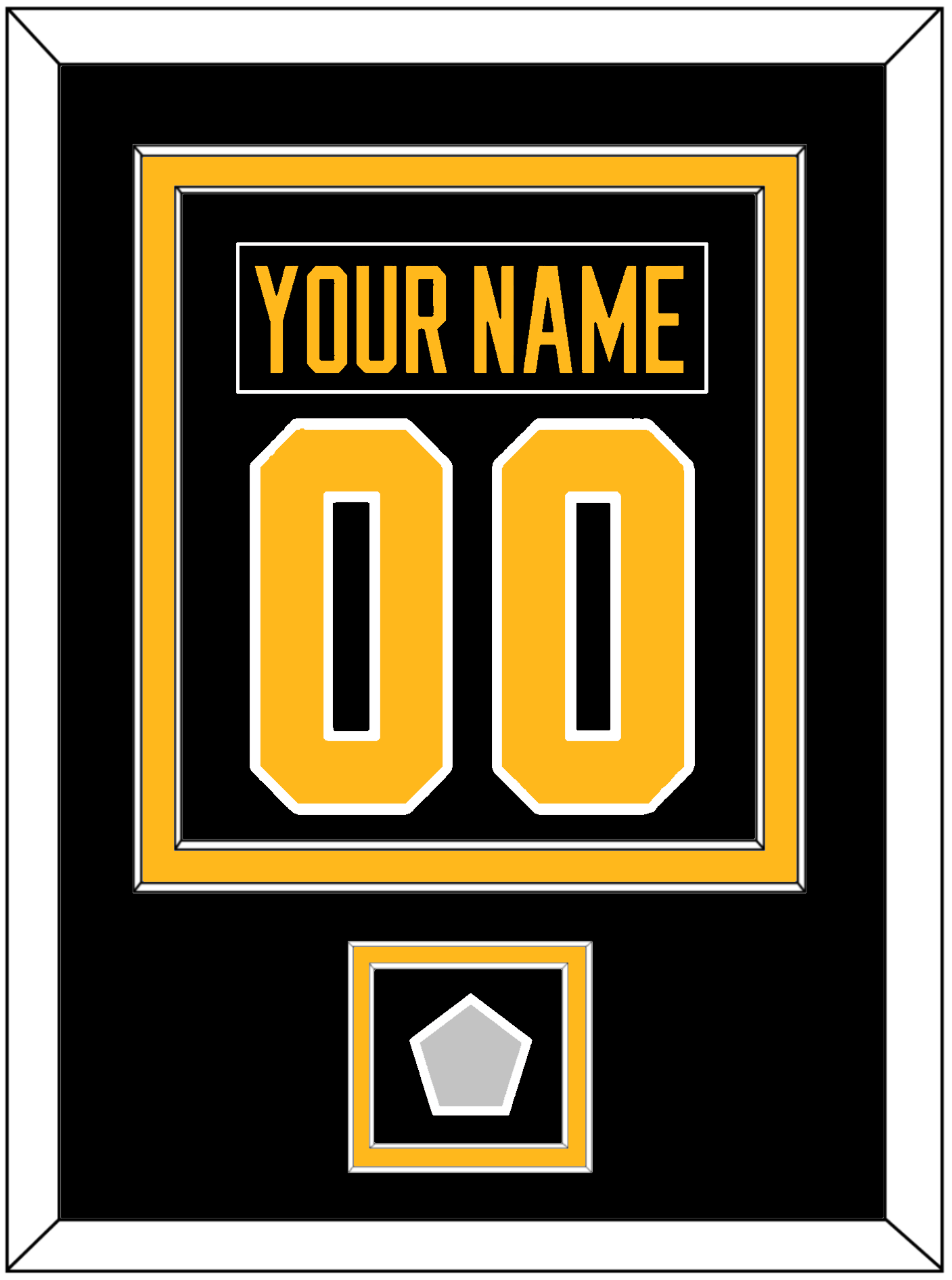 Pittsburgh Road Black Jersey (1988 Through 1992) Nameplate & Number (From The Back Of The Jersey) With A Stanley Cup Champions Patch: 1991, 1992, 2009, 2016 Or 2017. Double Mat Cut: Black Mat Over A Gold Mat. Black Nameplate, Gold Number & Patch Mounted On A Black Mat. White Frame.
