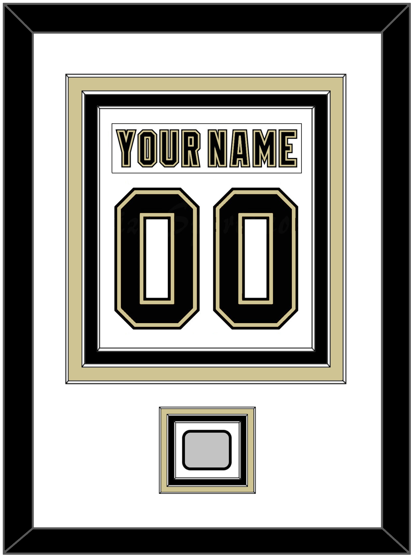 Pittsburgh Road White Jersey (2007 Through 2016) Nameplate & Number (From The Back Of The Jersey) With A Stanley Cup Champions Patch: 1991, 1992, 2009, 2016 Or 2017. Triple Mat Cut: White Mat Over A Black Mat Over A Gold Mat. White Nameplate, Black Number & Patch Mounted On A White Mat. Black Frame.