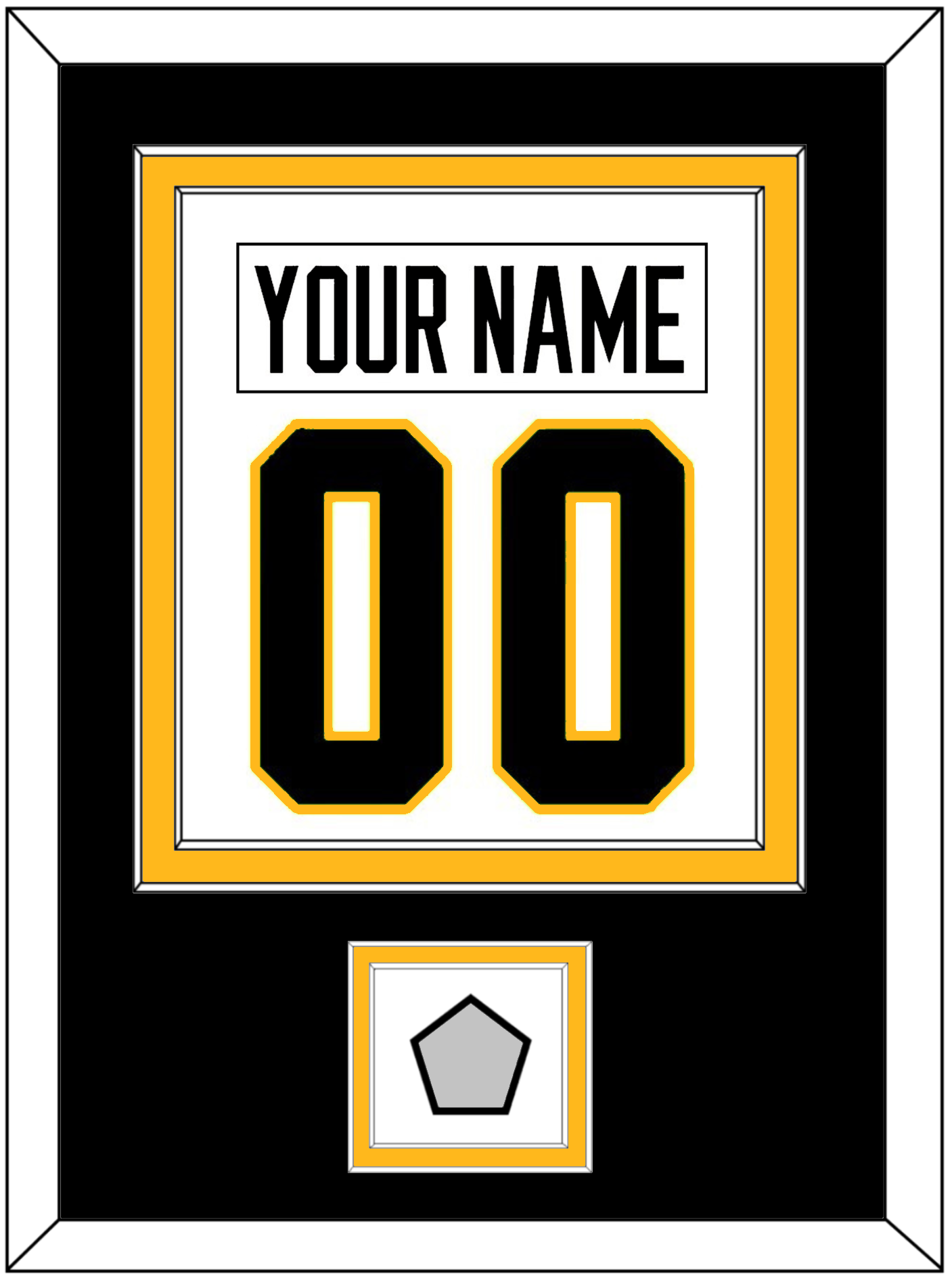 Pittsburgh Road White Jersey Nameplate & Number (From The Back Of The Jersey) With A Stanley Cup Champions Patch: 1991, 1992, 2009, 2016 Or 2017. Double Mat Cut: Black Mat Over A Gold Mat. White Nameplate, Black Number & Patch Mounted On A White Mat. White Frame.