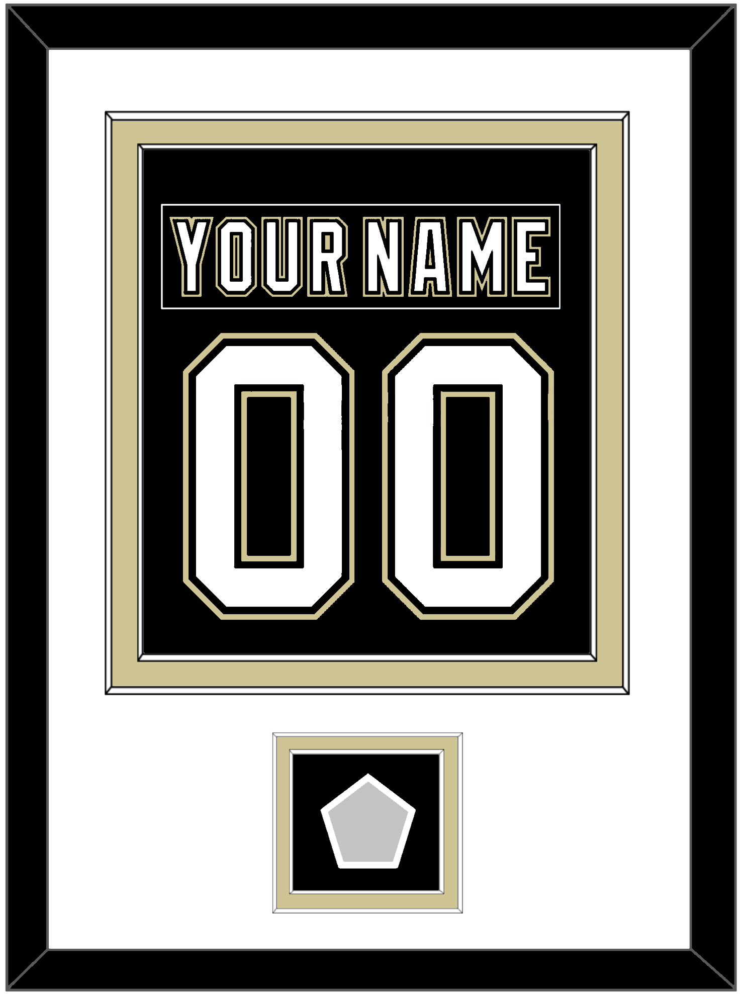 Pittsburgh Home Black Jersey (2007 Through 2016) Nameplate & Number (From The Back Of The Jersey) With A Stanley Cup Finals Patch: 1991, 1992, 2009, 2016 Or 2017. Double Mat Cut: White Mat Over A Gold Mat. Black Nameplate, White Number & Patch Mounted On A Black Mat. Black Frame.