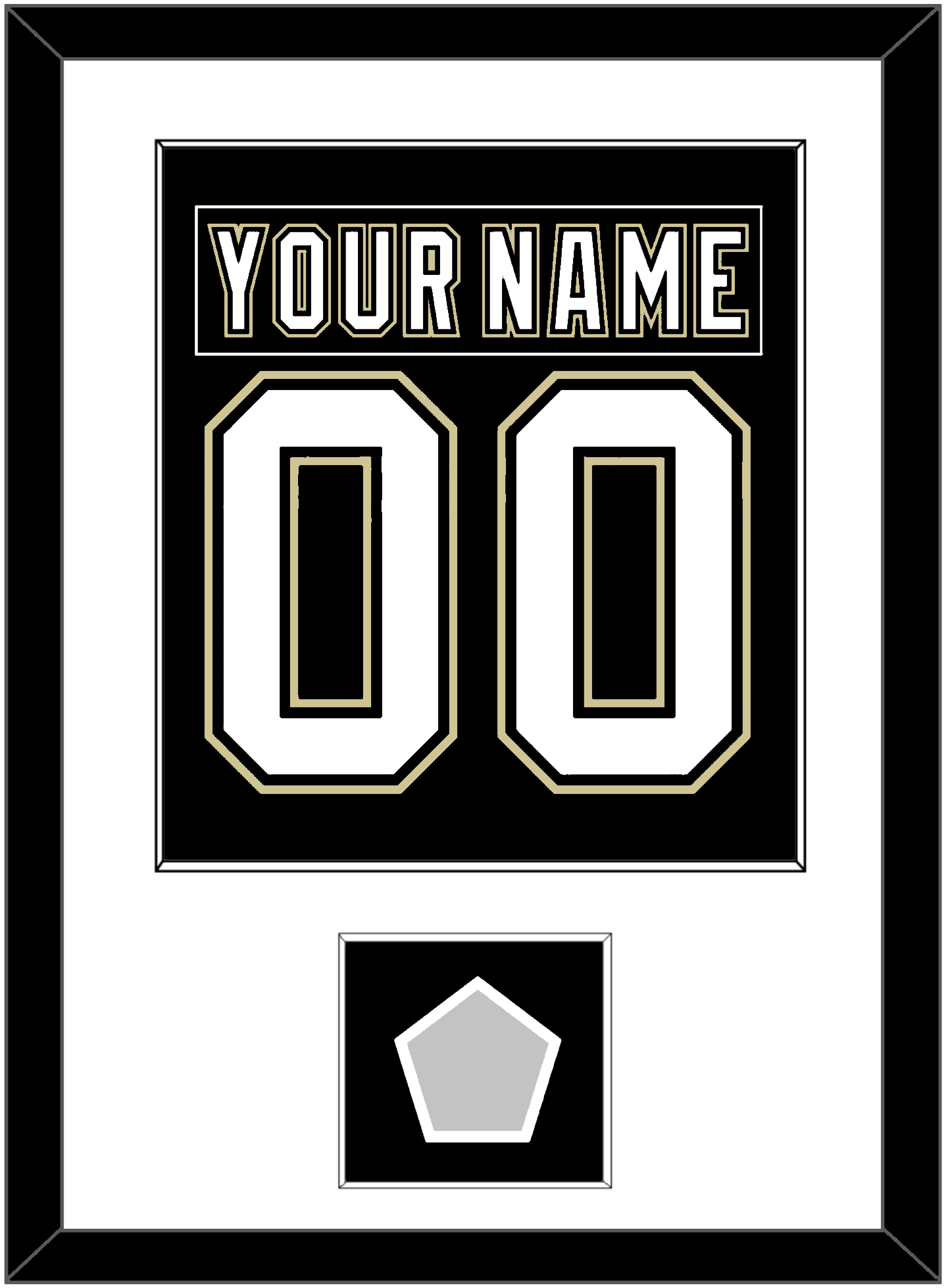 Pittsburgh Home Black Jersey (2007 Through 2016) Nameplate & Number (From The Back Of The Jersey) With A Stanley Cup Finals Patch: 1991, 1992, 2009, 2016 Or 2017. Single Mat Cut: White Mat With Black Nameplate, White Number & Patch Mounted On A Black Mat. Black Frame.