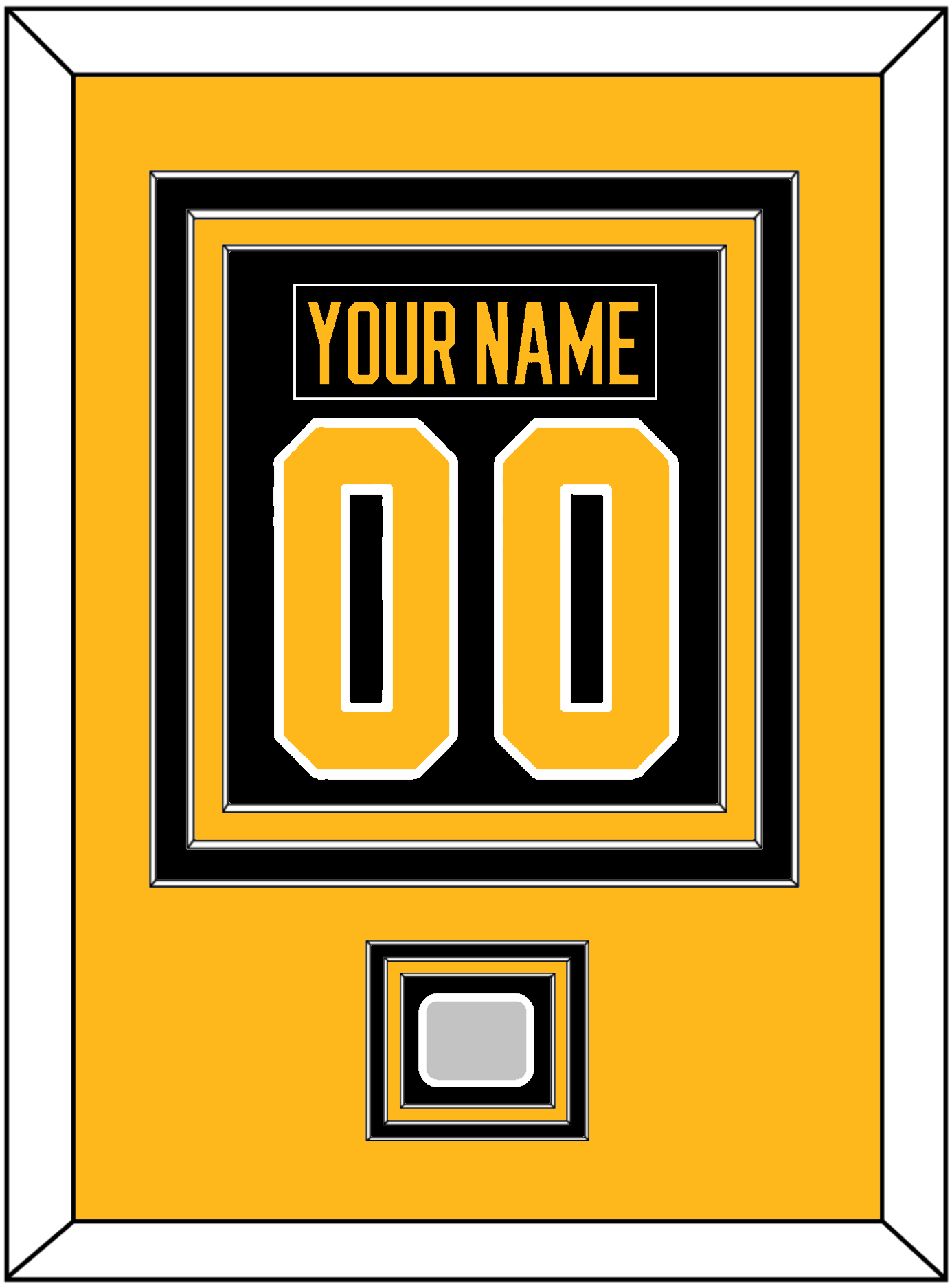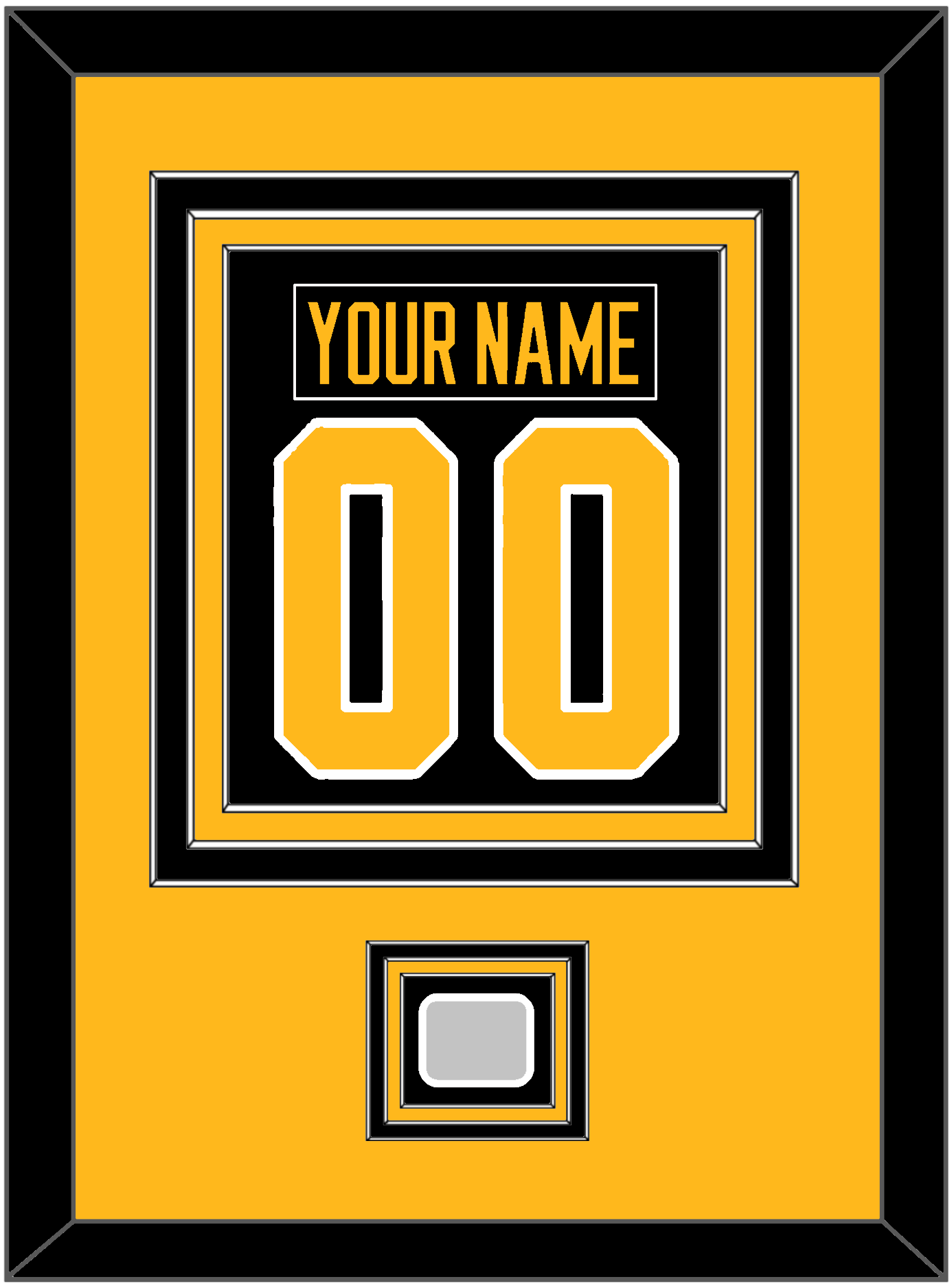Pittsburgh Home Black Jersey Nameplate & Number (From The Back Of The Jersey) With A Stanley Cup Finals Patch: 1991, 1992, 2009, 2016 Or 2017. Triple Mat Cut: Gold Mat Over A Black Mat Over A Gold Mat. Black Nameplate, Gold Number & Patch Mounted On A Black Mat. Black Or White Frame.
