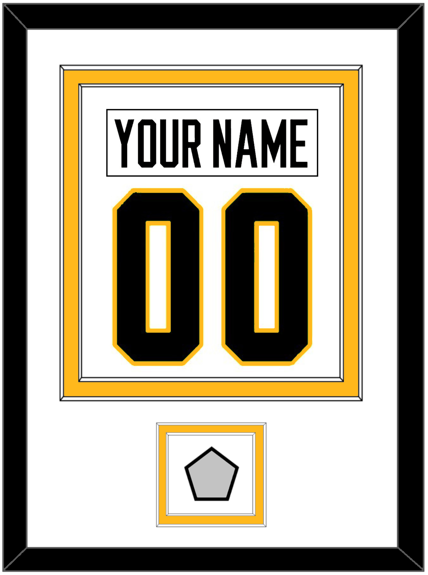Pittsburgh Home White Jersey (1988 Through 1992) Nameplate & Number (From The Back Of The Jersey) With A Stanley Cup Finals Patch: 1991, 1992, 2009, 2016 Or 2017. Double Mat Cut: White Mat Over A Gold Mat. White Nameplate, Black Number & Patch Mounted On A White Mat. Black Frame.