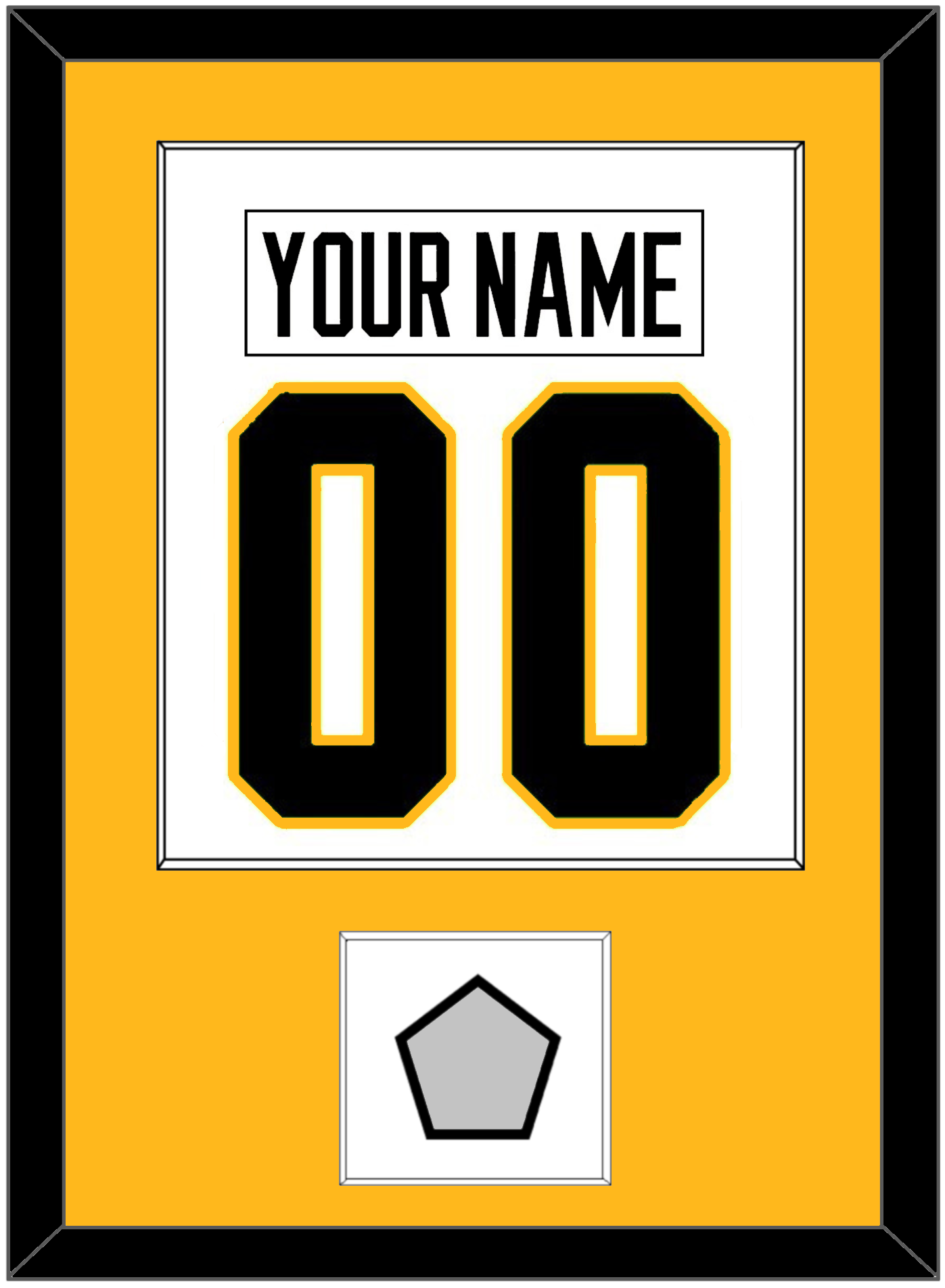 Pittsburgh Home White Jersey (1988 Through 1992) Nameplate & Number (From The Back Of The Jersey) With A Stanley Cup Finals Patch: 1991, 1992, 2009, 2016 Or 2017.  Single Mat Cut:  Gold Mat With  White Nameplate, Black Number & Patch Mounted On A White Mat.  Black Or White Frame.