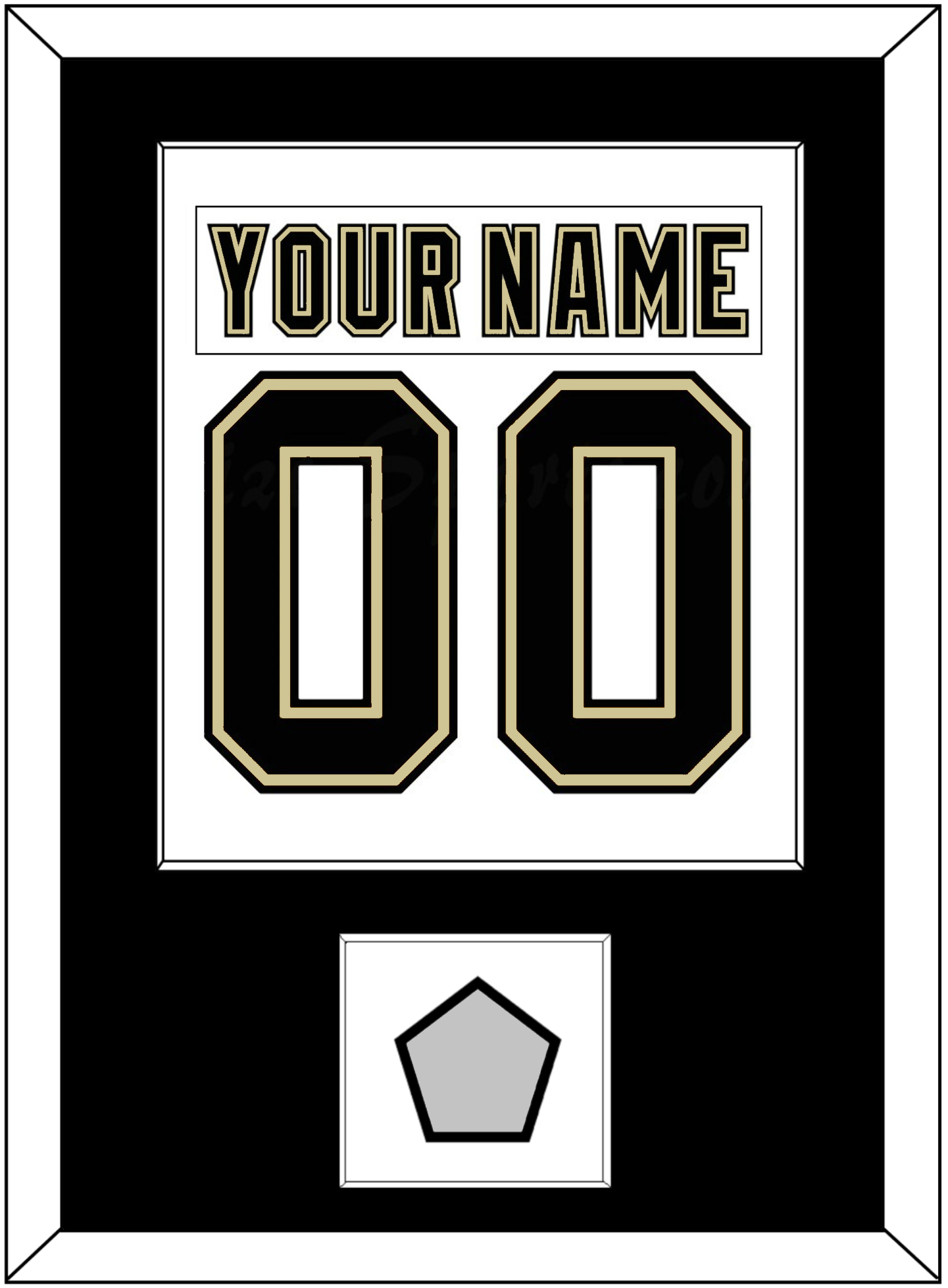 Pittsburgh Road White Jersey (2007 Through 2016) Nameplate & Number (From The Back Of The Jersey) With A Stanley Cup Finals Patch: 1991, 1992, 2009, 2016 Or 2017. Single Mat Cut: Black Mat With White Nameplate, Black Number & Patch Mounted On A White Mat. White Frame.
